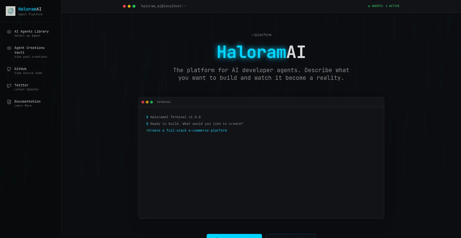 The platform for AI developer agents. Describe what you want to build and watch it become a reality.