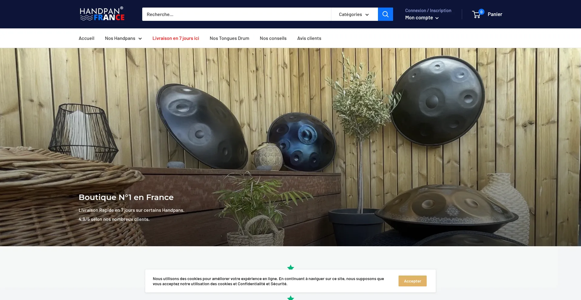 Analysis indicates that handpan-france.com operates as an e-commerce platform facilitating online transactions for goods or services. The website implements shopping cart functionality, payment processing systems, and product catalog features typical of commercial retail operations.