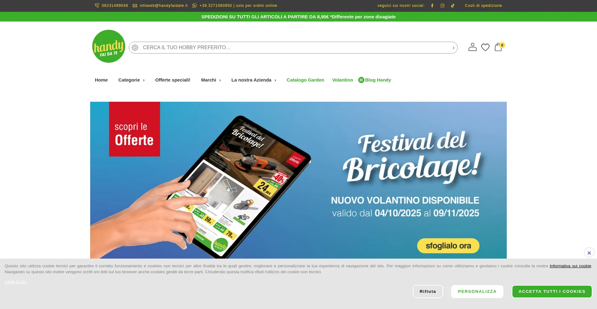 Analysis indicates that handyfaidate.it operates as an e-commerce platform facilitating online transactions for goods or services. The website implements shopping cart functionality, payment processing systems, and product catalog features typical of commercial retail operations.