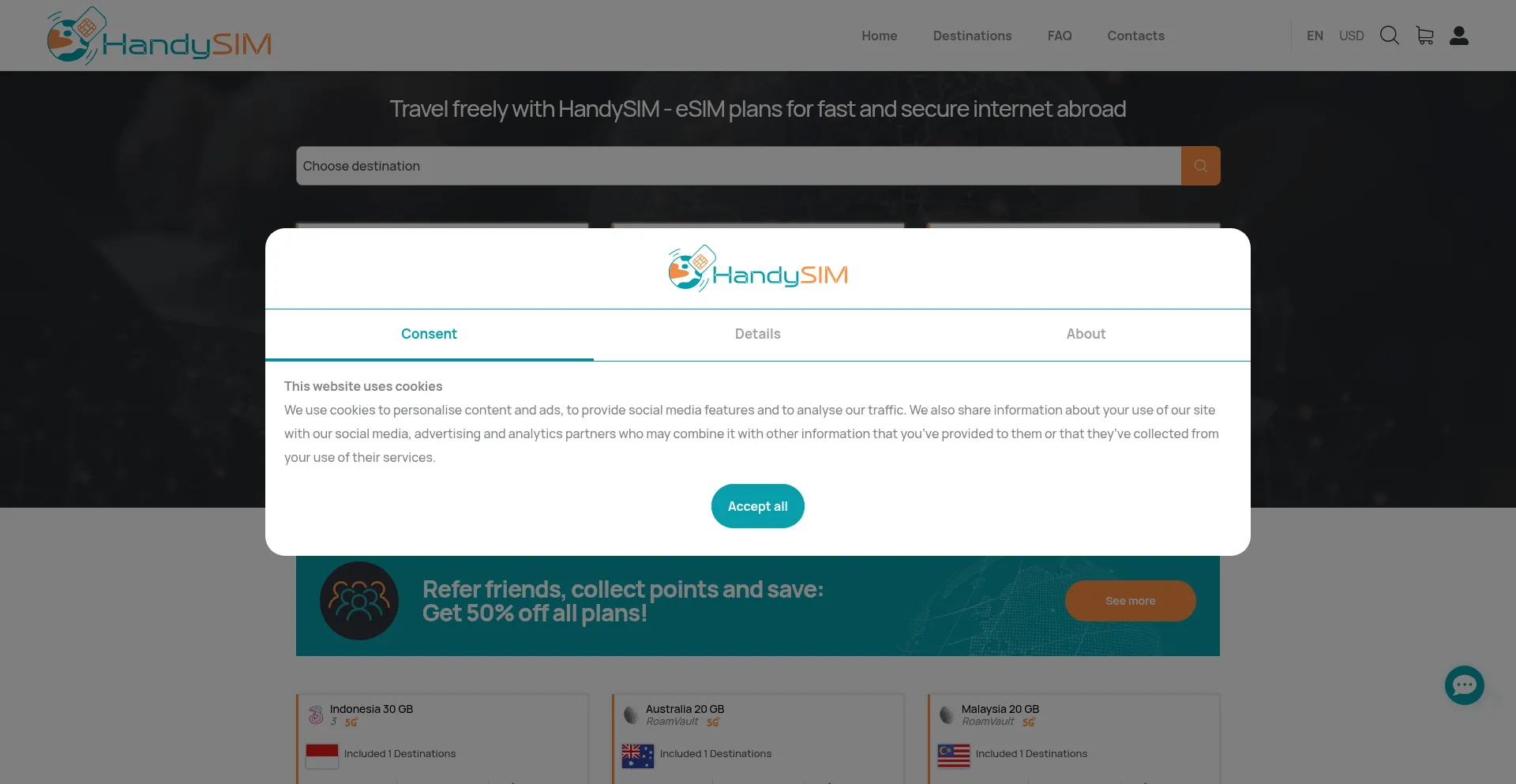 The website implements cookie consent mechanisms in compliance with privacy regulations such as GDPR or CCPA. This demonstrates that handysim.com adheres to data protection standards and provides users with control over personal data collection practices.