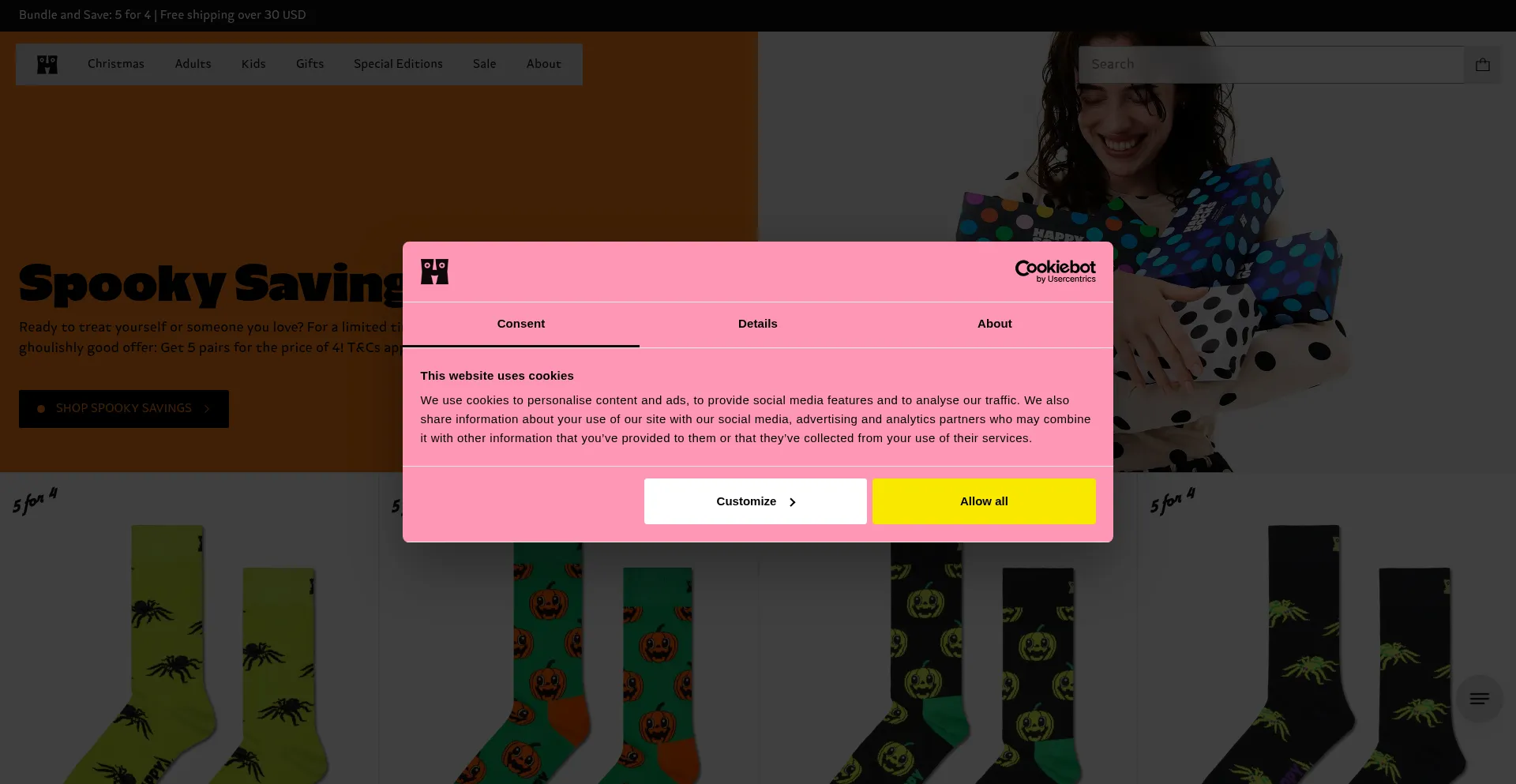 The website implements cookie consent mechanisms in compliance with privacy regulations such as GDPR or CCPA. This demonstrates that happysocks.com adheres to data protection standards and provides users with control over personal data collection practices.