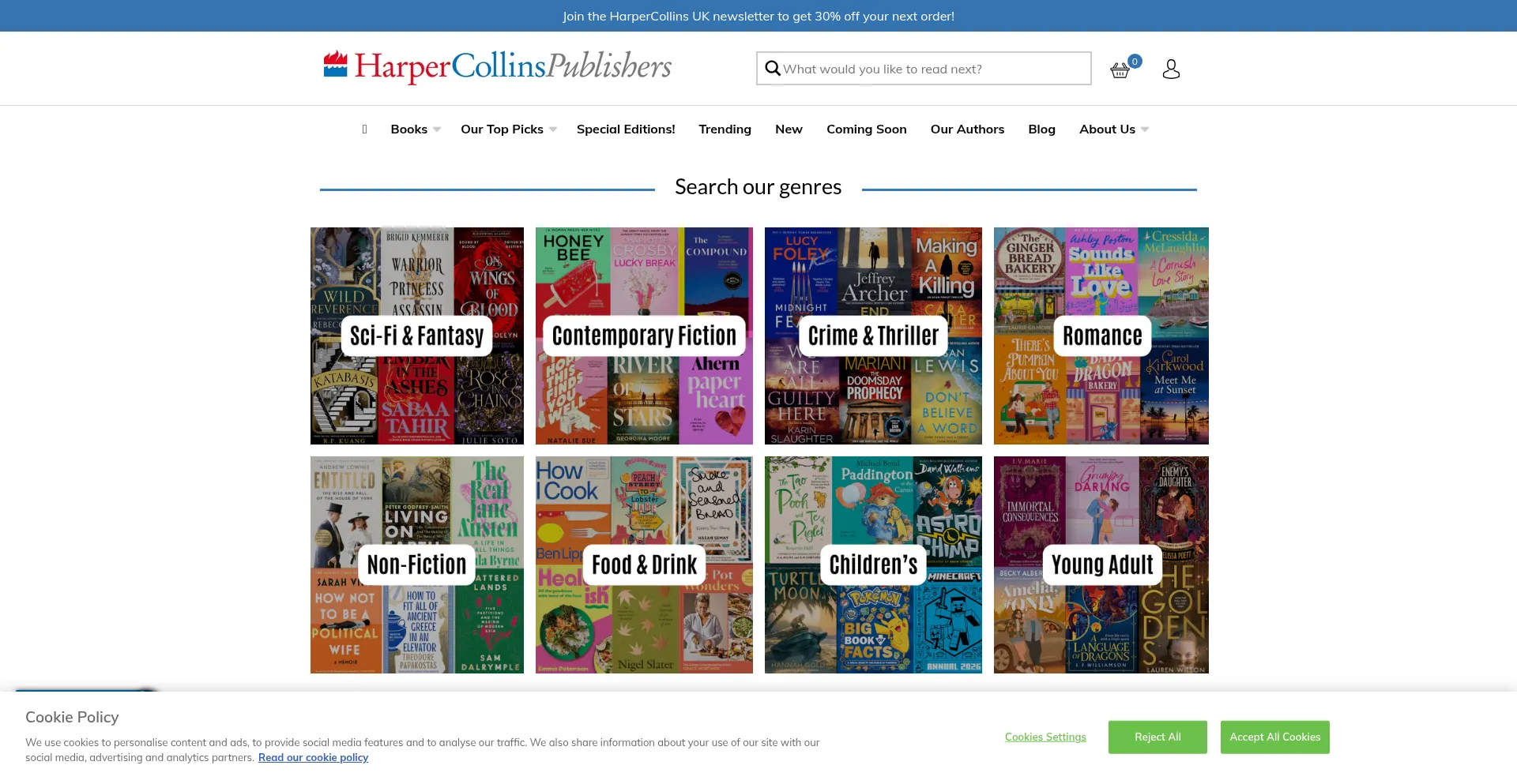The website implements cookie consent mechanisms in compliance with privacy regulations such as GDPR or CCPA. This demonstrates that harpercollins.co.uk adheres to data protection standards and provides users with control over personal data collection practices.