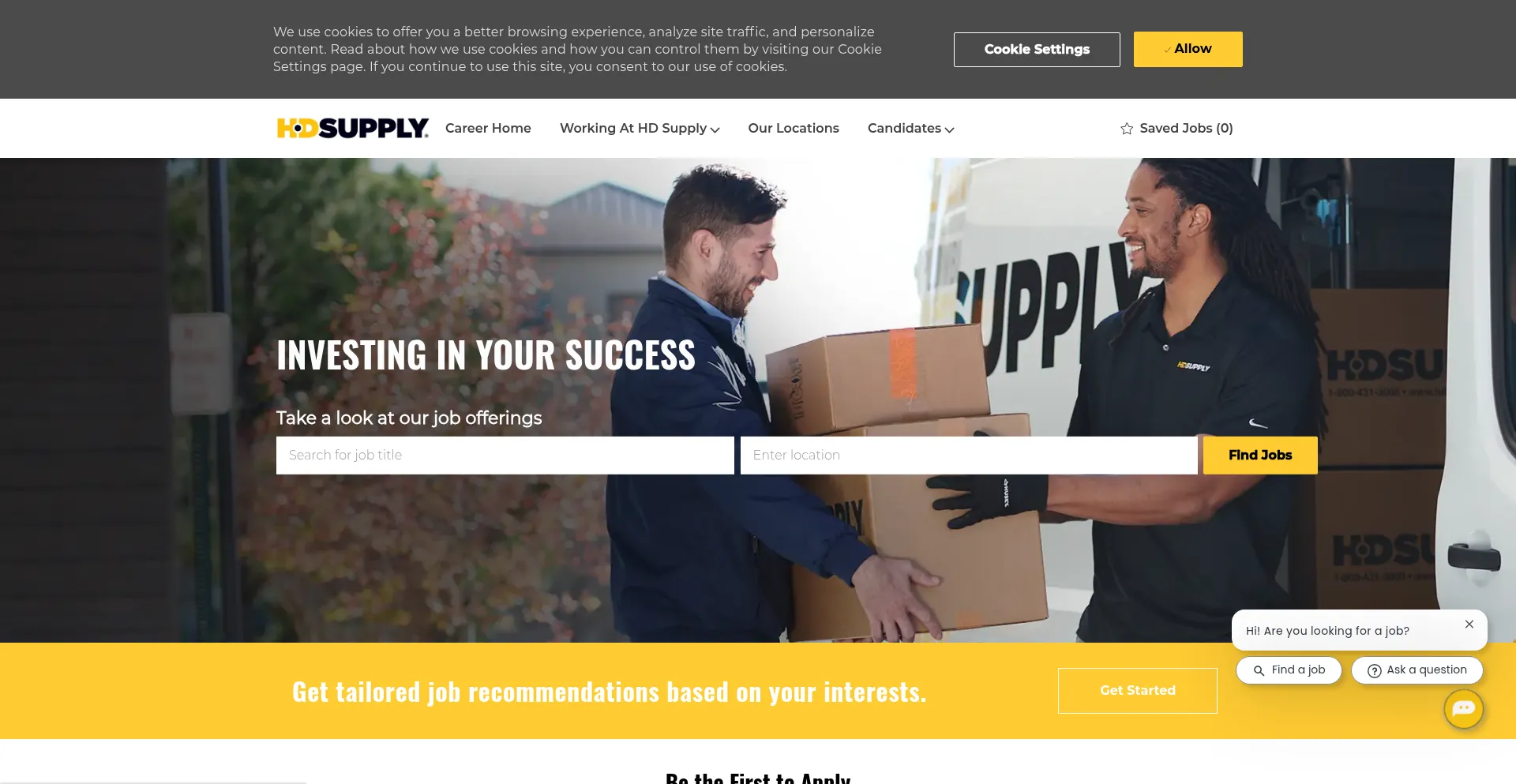 The website implements cookie consent mechanisms in compliance with privacy regulations such as GDPR or CCPA. This demonstrates that hdsupply.jobs adheres to data protection standards and provides users with control over personal data collection practices.