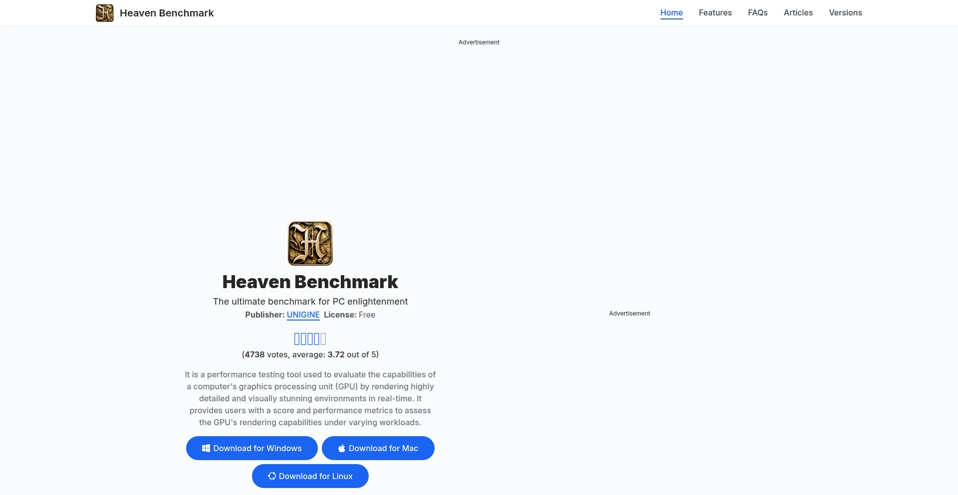 Benchmark your GPU's performance with Heaven Benchmark by UNIGINE. This tool offers real-time rendering with DirectX 9, DirectX 11, and OpenGL 4.0 support.
