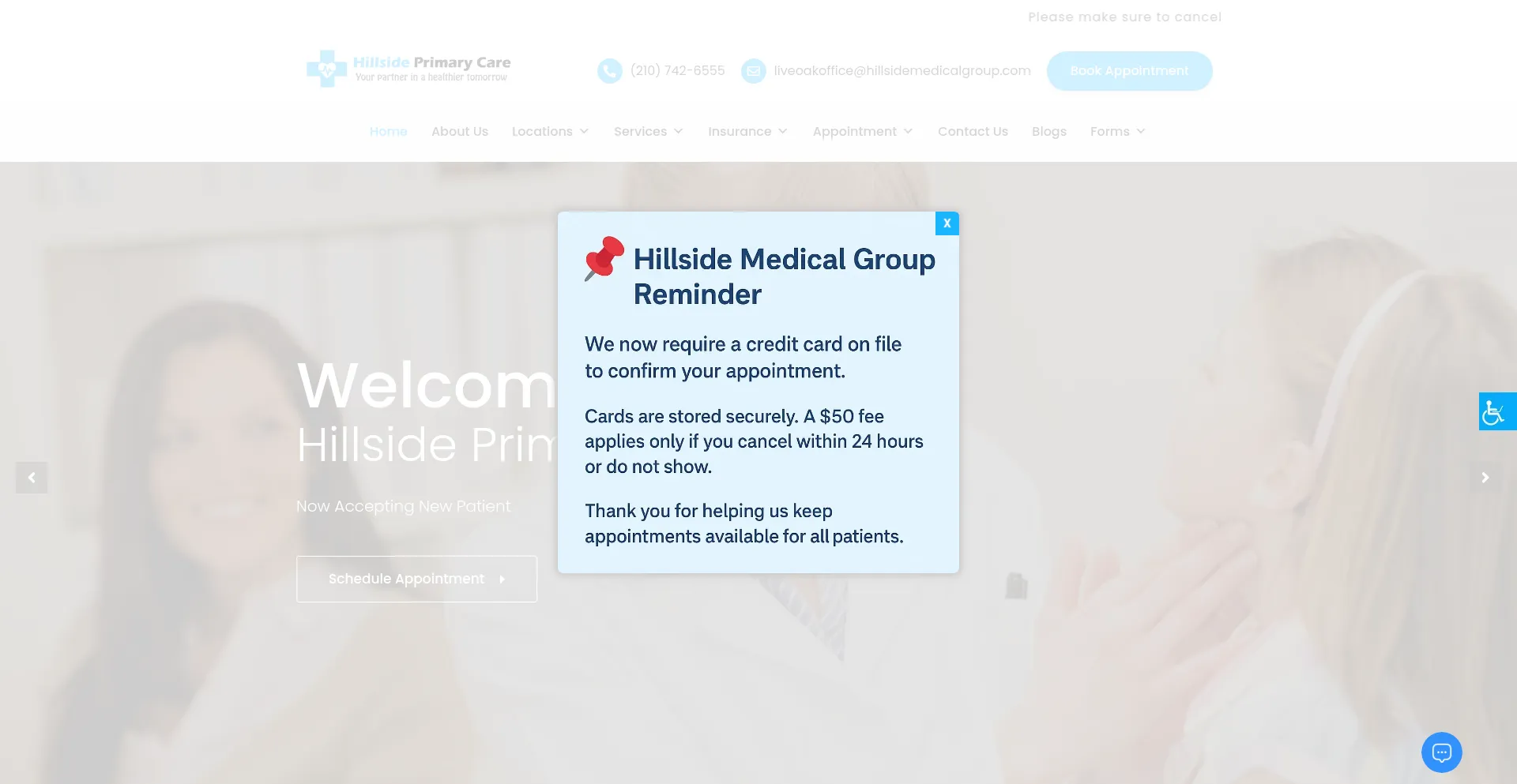 The hillsideprimarycare.com website implements data collection forms that may request personal information including names, email addresses, phone numbers, or other sensitive details. Users should verify the legitimacy of it and review privacy policies before submitting personal data.
