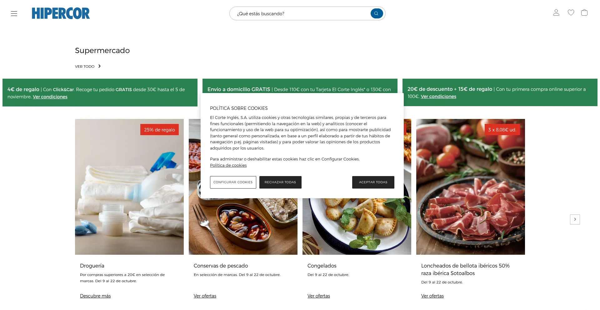The website implements cookie consent mechanisms in compliance with privacy regulations such as GDPR or CCPA. This demonstrates that hipercor.es adheres to data protection standards and provides users with control over personal data collection practices.