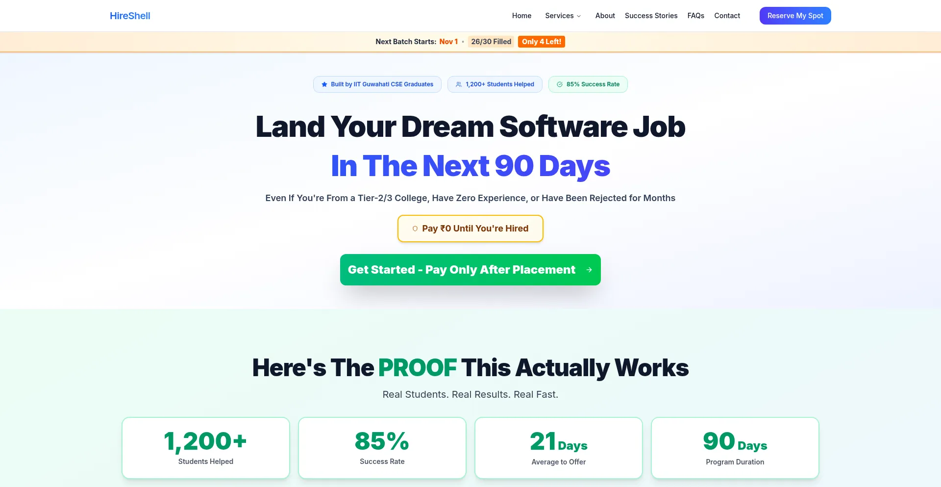 1,200+ students hired. 85% success rate. We fix your profile, apply to 1000+ jobs, and prepare you for interviews. Pay only 10% CTC after placement. Even if you're from Tier-2/3...