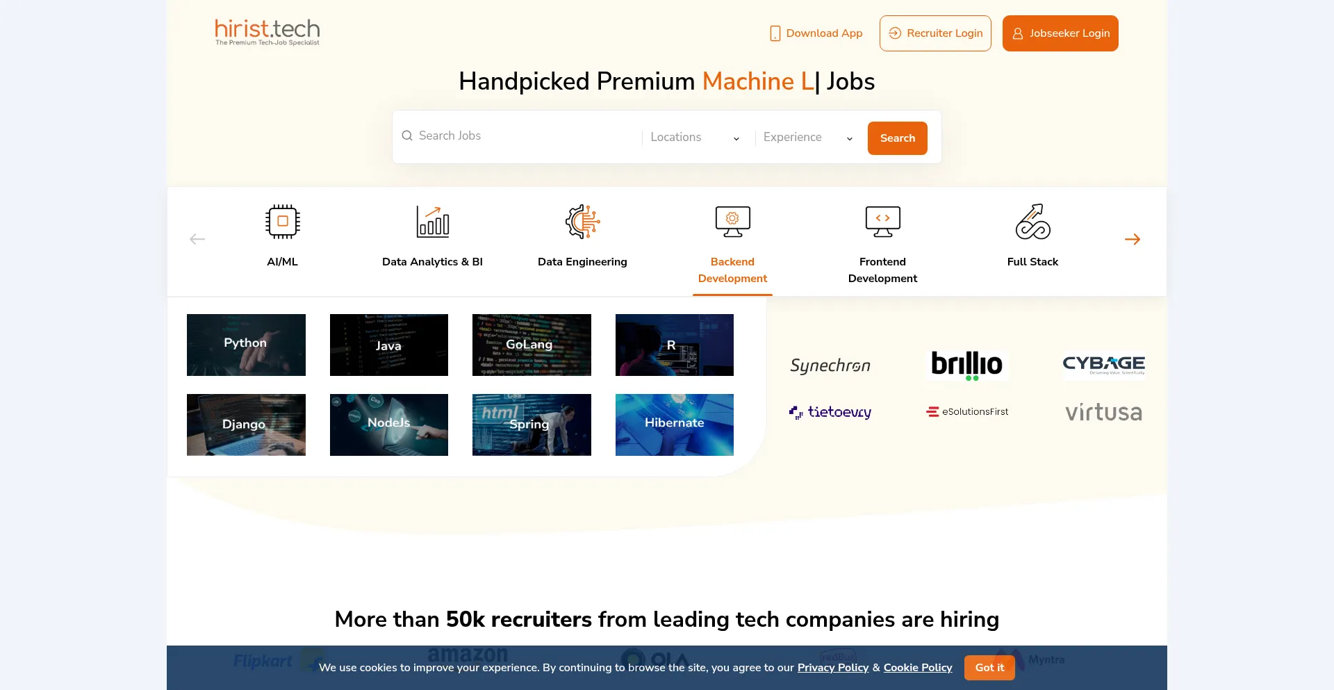 The website implements cookie consent mechanisms in compliance with privacy regulations such as GDPR or CCPA. This demonstrates that hirist.tech adheres to data protection standards and provides users with control over personal data collection practices.