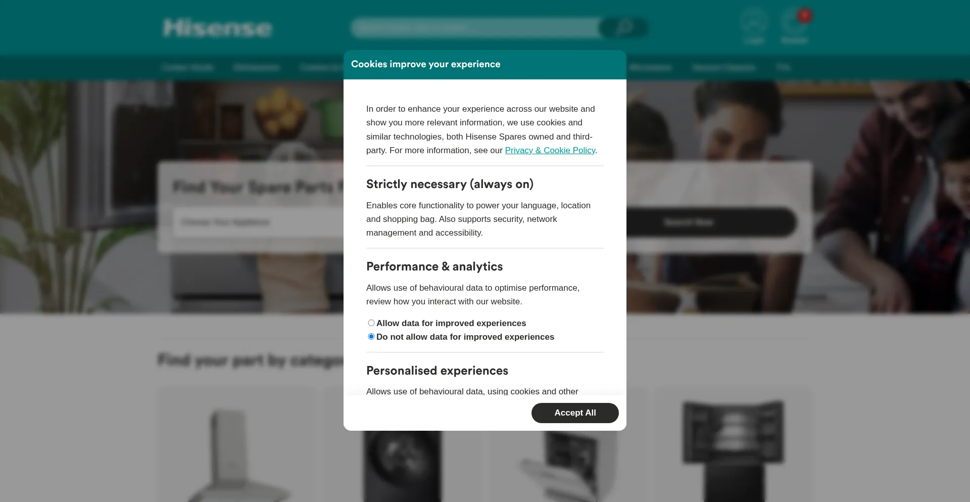 The website implements cookie consent mechanisms in compliance with privacy regulations such as GDPR or CCPA. This demonstrates that hisensespares.co.uk adheres to data protection standards and provides users with control over personal data collection practices.