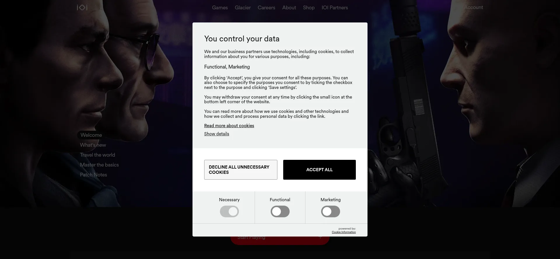 The website implements cookie consent mechanisms in compliance with privacy regulations such as GDPR or CCPA. This demonstrates that hitman.com adheres to data protection standards and provides users with control over personal data collection practices.
