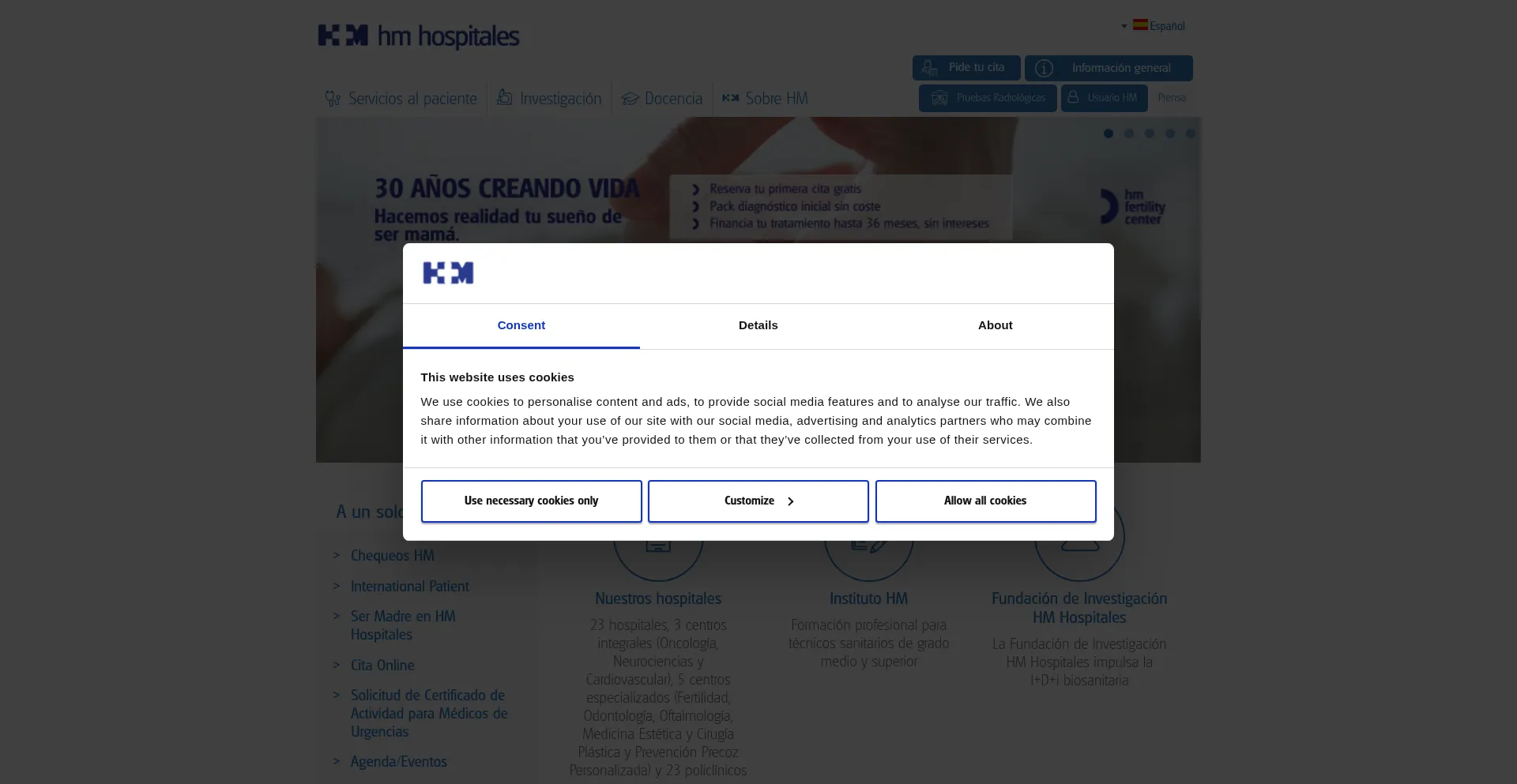 The website implements cookie consent mechanisms in compliance with privacy regulations such as GDPR or CCPA. This demonstrates that hmhospitales.com adheres to data protection standards and provides users with control over personal data collection practices.