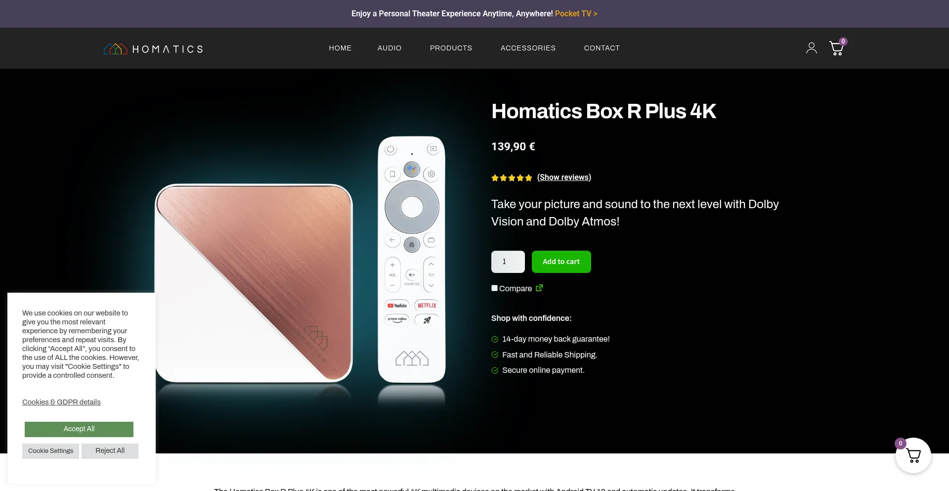 Homatics Box R Plus 4K is powerful 4K multimedia devices with Android TV. Dolby Vision / Atmos, 32GB Flash, 4GB RAM, 1000Mbps ethernet.