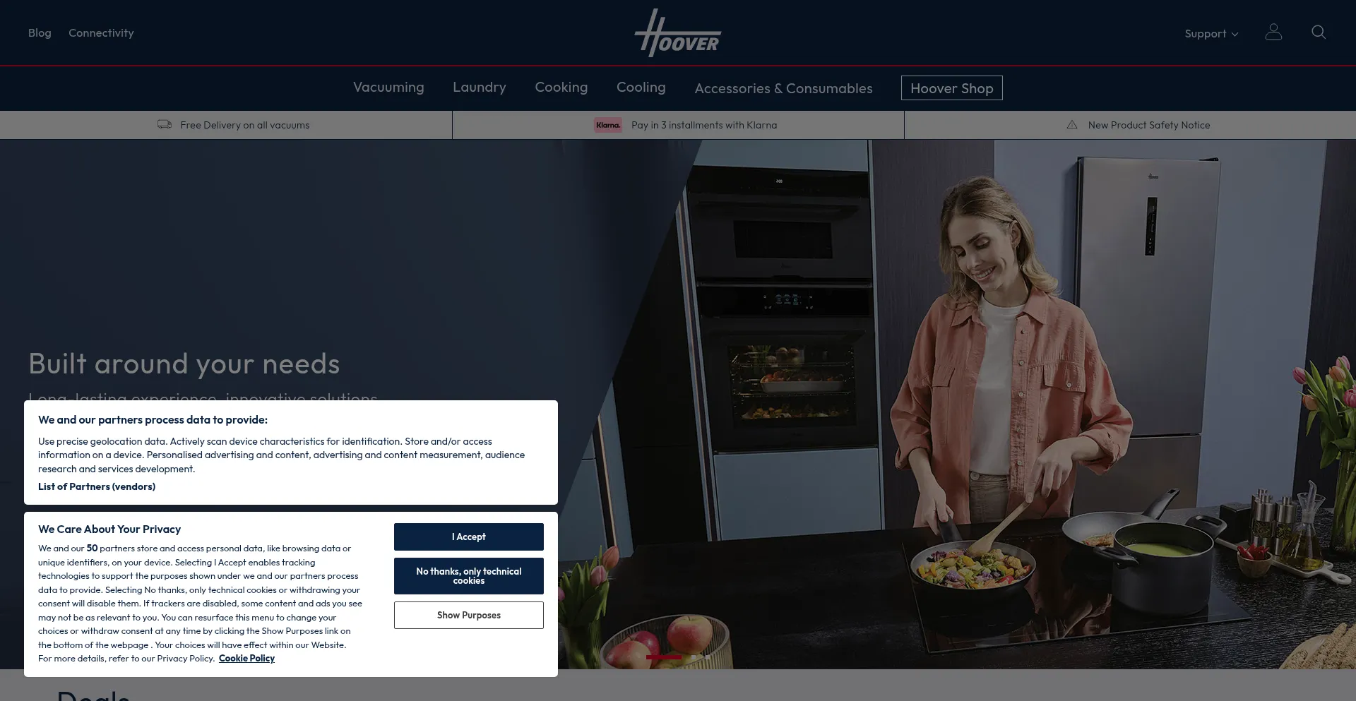 The website implements cookie consent mechanisms in compliance with privacy regulations such as GDPR or CCPA. This demonstrates that hoover.co.uk adheres to data protection standards and provides users with control over personal data collection practices.