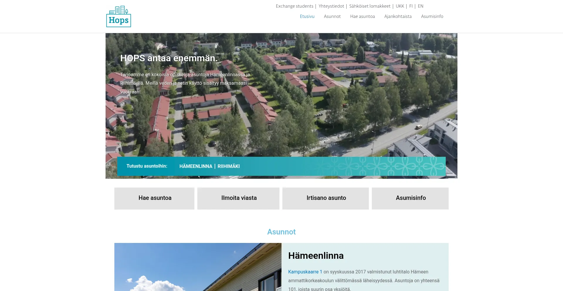 Tarjoamme eri kokoisia opiskelija-asuntoja Hämeenlinnassa ja Riihimäellä. Meillä sähkön, veden ja pesutuvan käyttö sisältyy maksamaasi vuokraan!