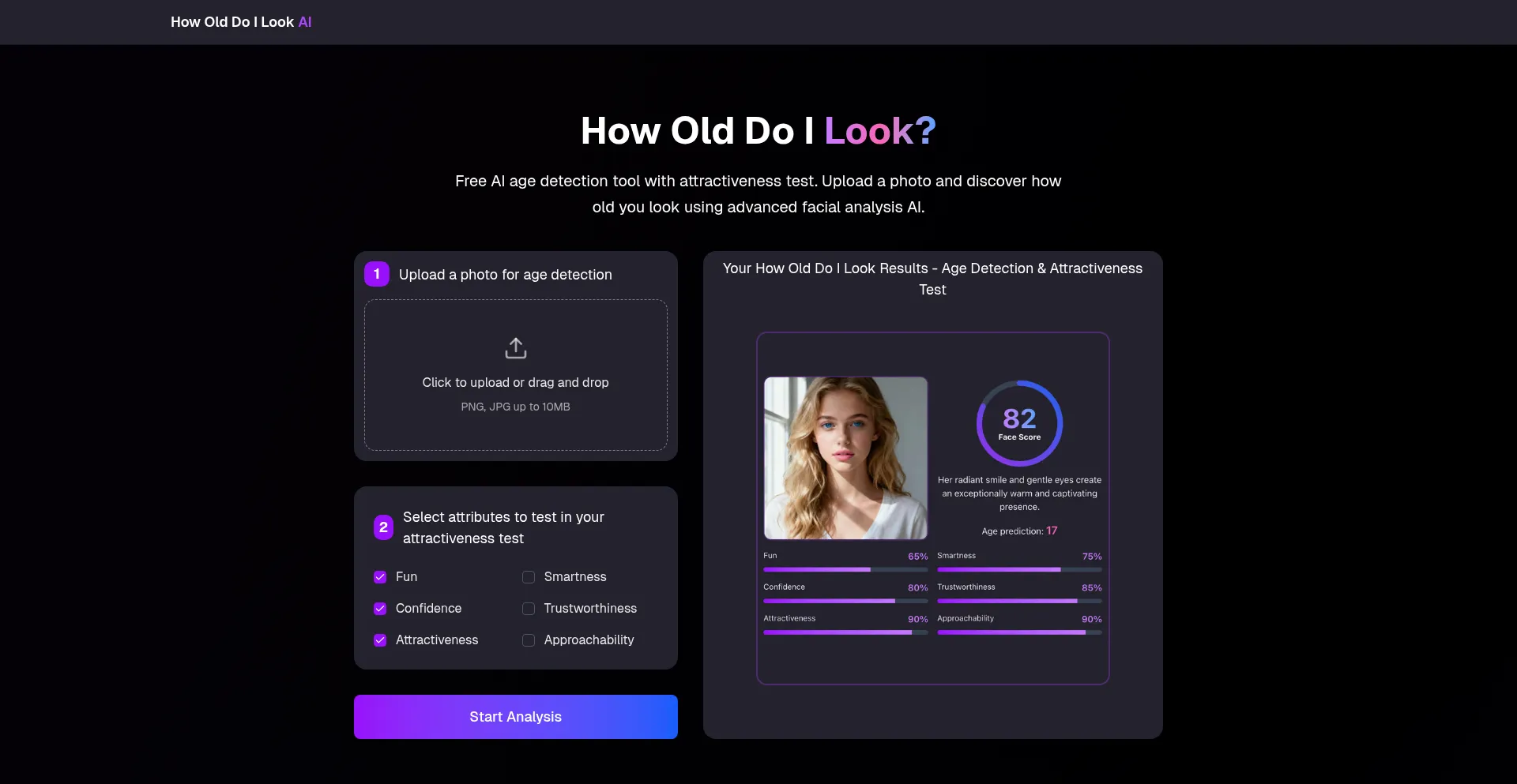 Discover how old you look with our free AI-powered age detection tool. Get instant age predictions, attractiveness tests, and fun facial analysis. No registration required. Try ...