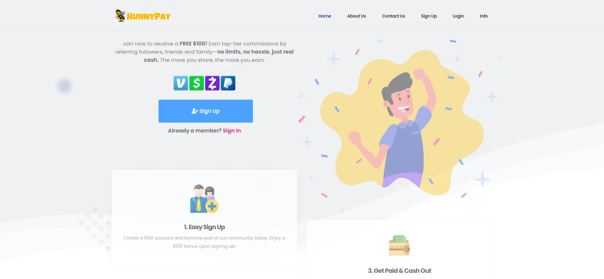 Hunnypay.com operates as a suspicious website with multiple red flags that compromise its trustworthiness and user safety. The platform exhibits concerning characteristics including misleading information, questionable operational practices, or potential malware distribution that poses significant risks to visitors.