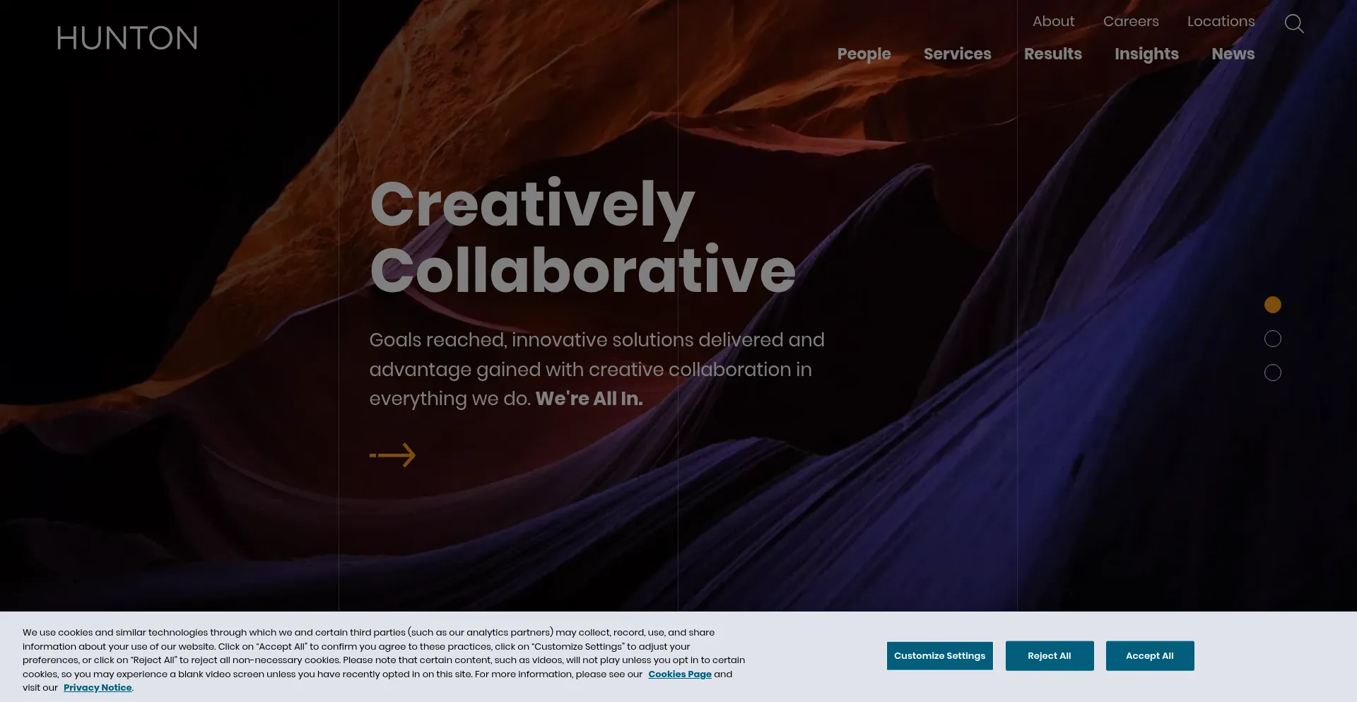 The website implements cookie consent mechanisms in compliance with privacy regulations such as GDPR or CCPA. This demonstrates that hunton.com adheres to data protection standards and provides users with control over personal data collection practices.