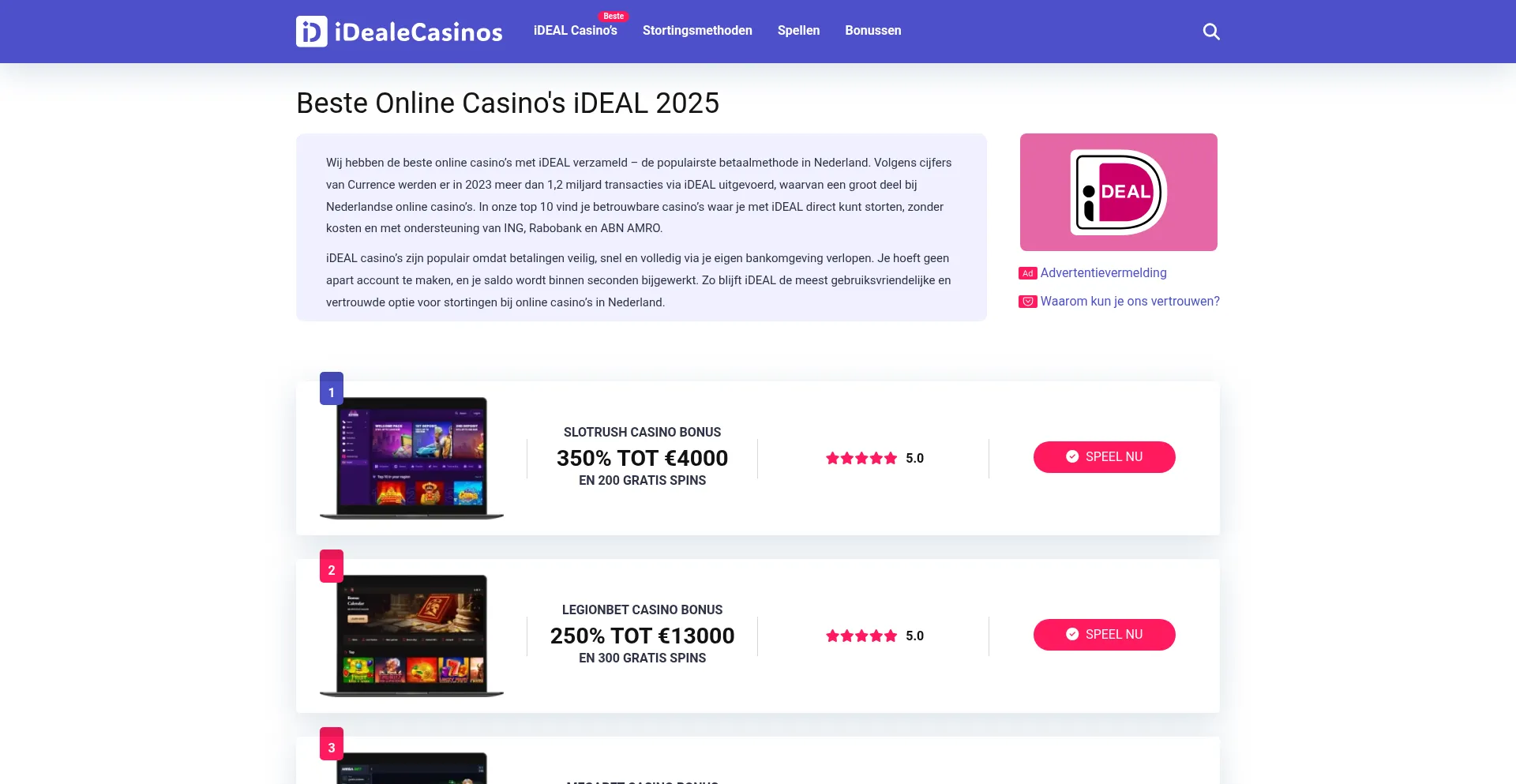 Expert ranking van iDEAL Casino's Online NL aanbiedingen voor [december 2025] TOP-3: SLOTRUSH CASINO ᐈ 350% TOT €4000 + 200 FS | MEGABET CASINO ᐈ 500% TOT €12000 + 777 F...