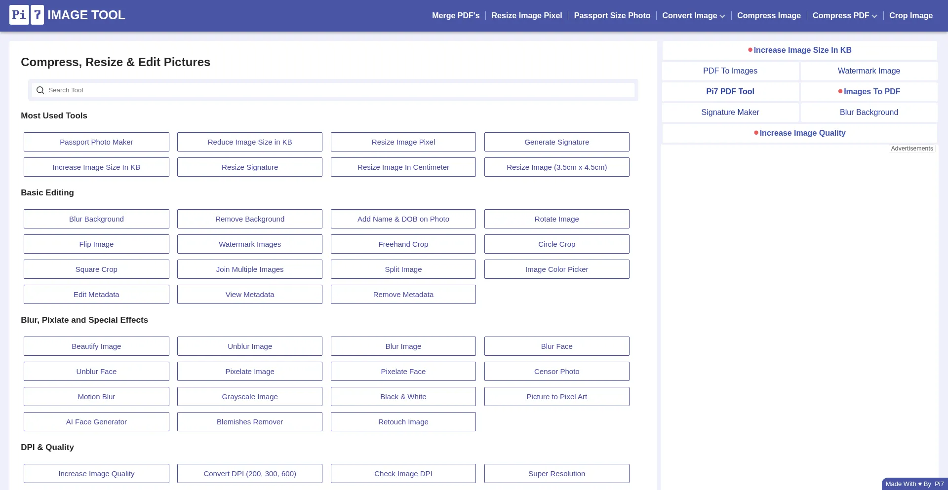 Pi7 Image Tool is a collection of some online tools like Image Compressor, Image resize tool, and Image conversion tools (Image to JPG, Image to PNG, etc).