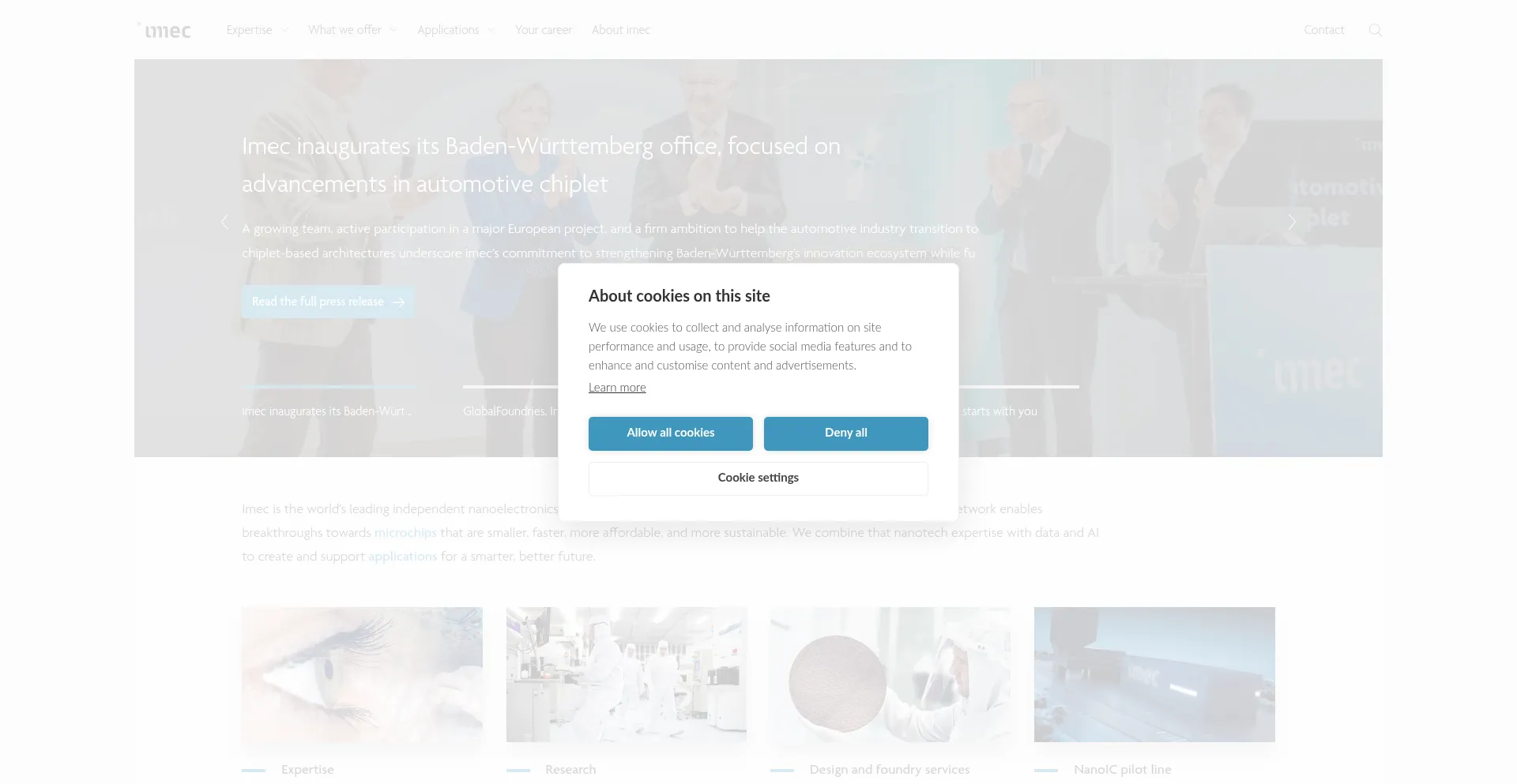 The website implements cookie consent mechanisms in compliance with privacy regulations such as GDPR or CCPA. This demonstrates that imec-int.com adheres to data protection standards and provides users with control over personal data collection practices.