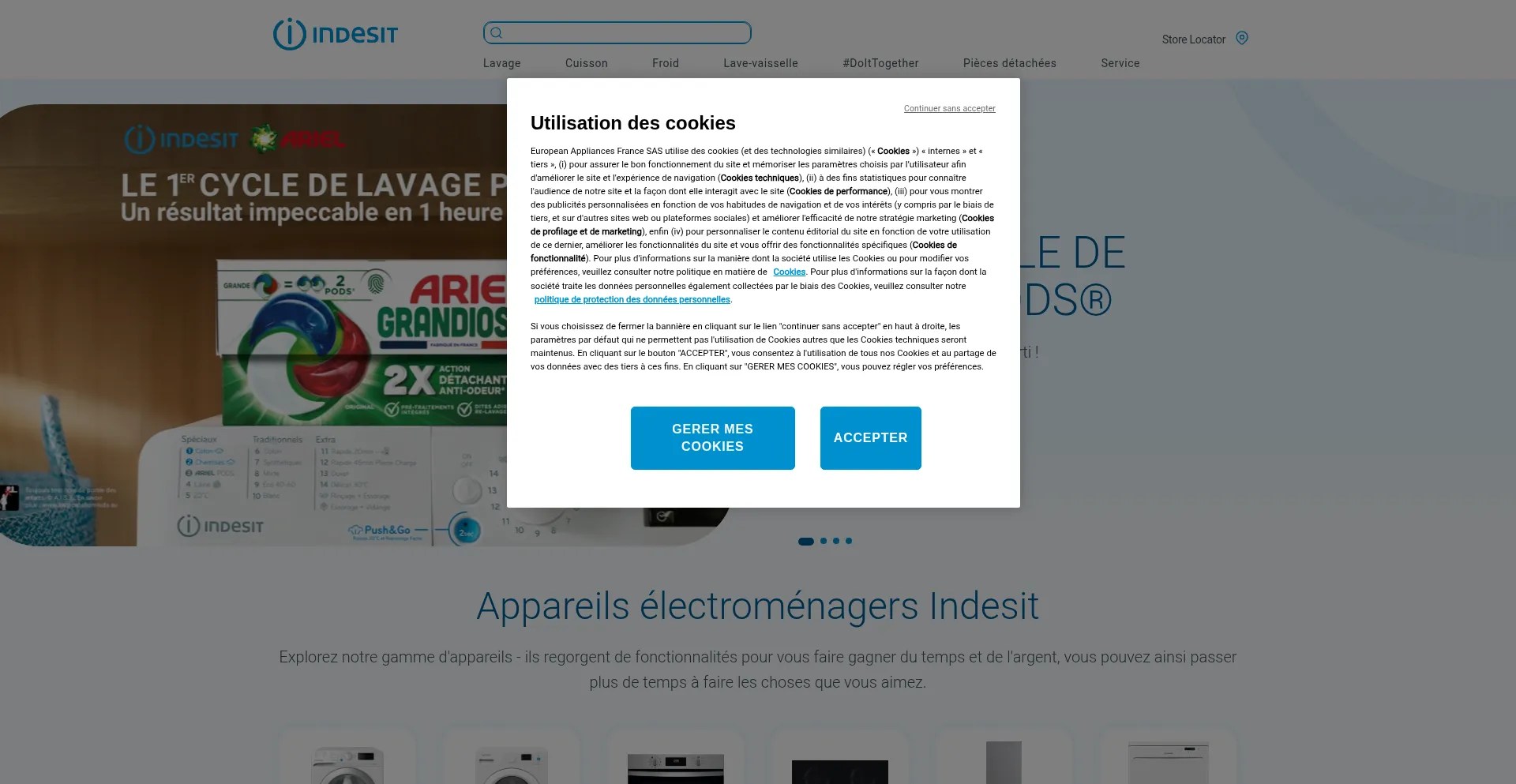 The website implements cookie consent mechanisms in compliance with privacy regulations such as GDPR or CCPA. This demonstrates that indesit.fr adheres to data protection standards and provides users with control over personal data collection practices.