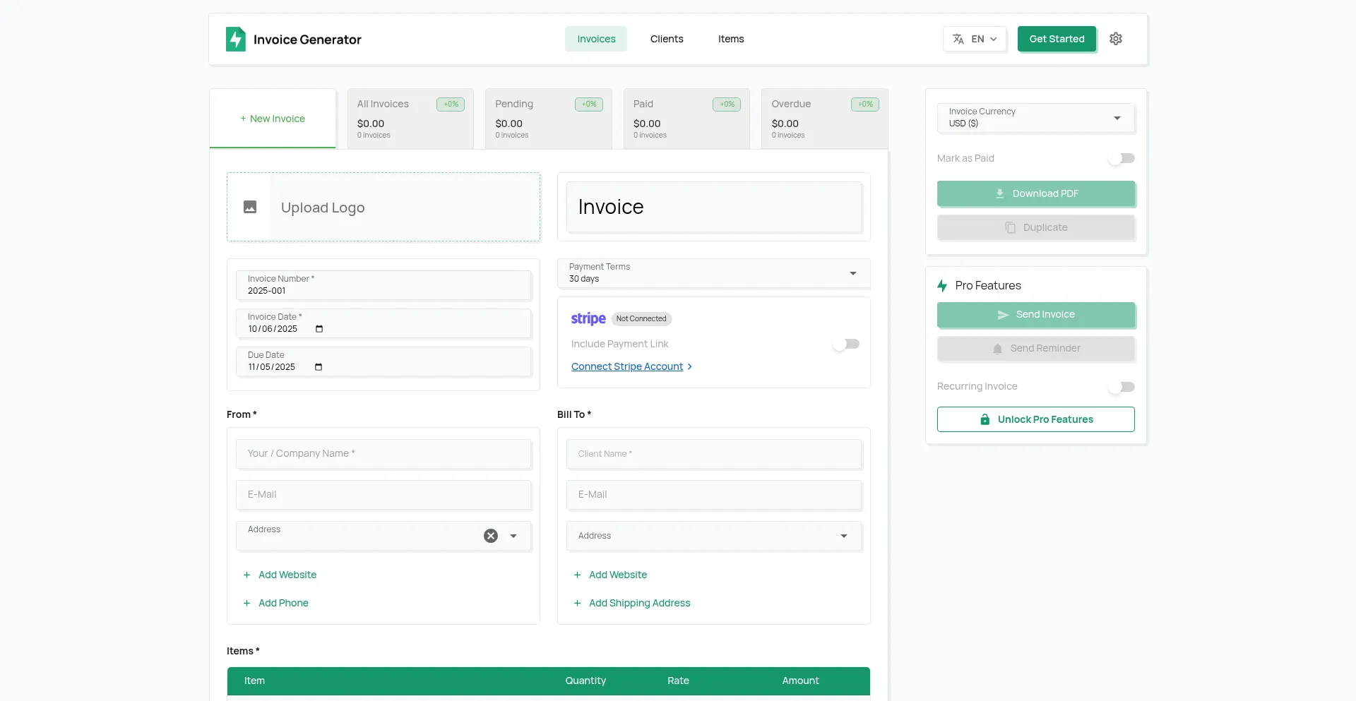 Free online invoice generator. Create professional invoices in PDF or Word instantly — no signup or credit card required.