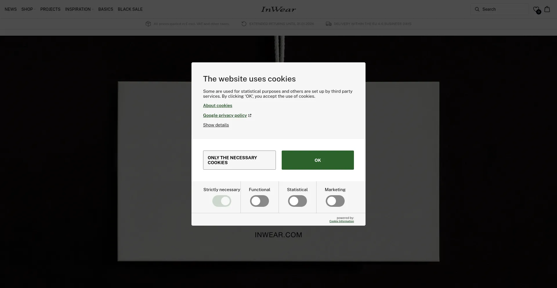 The website implements cookie consent mechanisms in compliance with privacy regulations such as GDPR or CCPA. This demonstrates that inwear.com adheres to data protection standards and provides users with control over personal data collection practices.