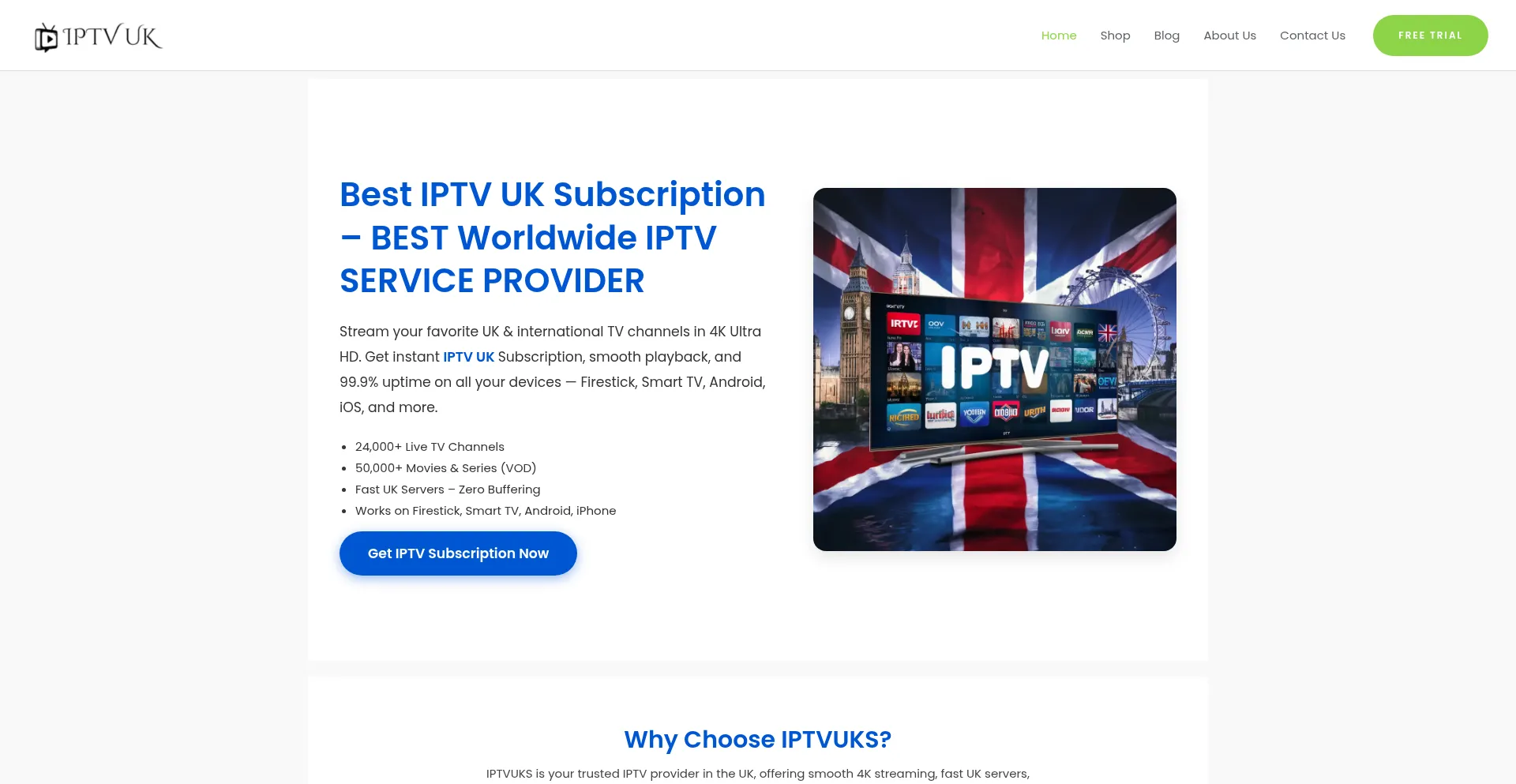 Get your IPTV UK Subscription today and enjoy 24,000+ live TV channels, movies, and series in HD & 4K.Affordable IPTV service for UK users.