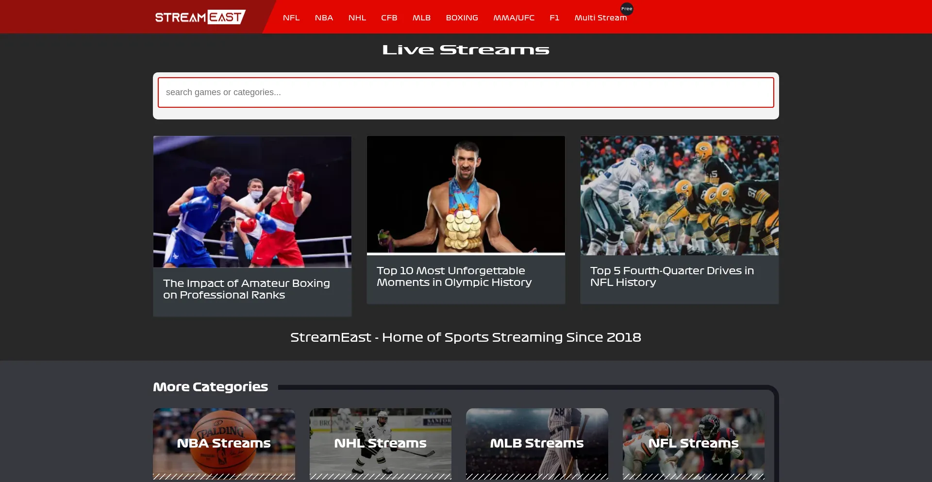 Stream live sports in HD for free on StreamEast! Enjoy NFL, NBA, UFC, MLB, and more with zero sign-ups. Your go-to platform for high-quality sports streaming anywhere.