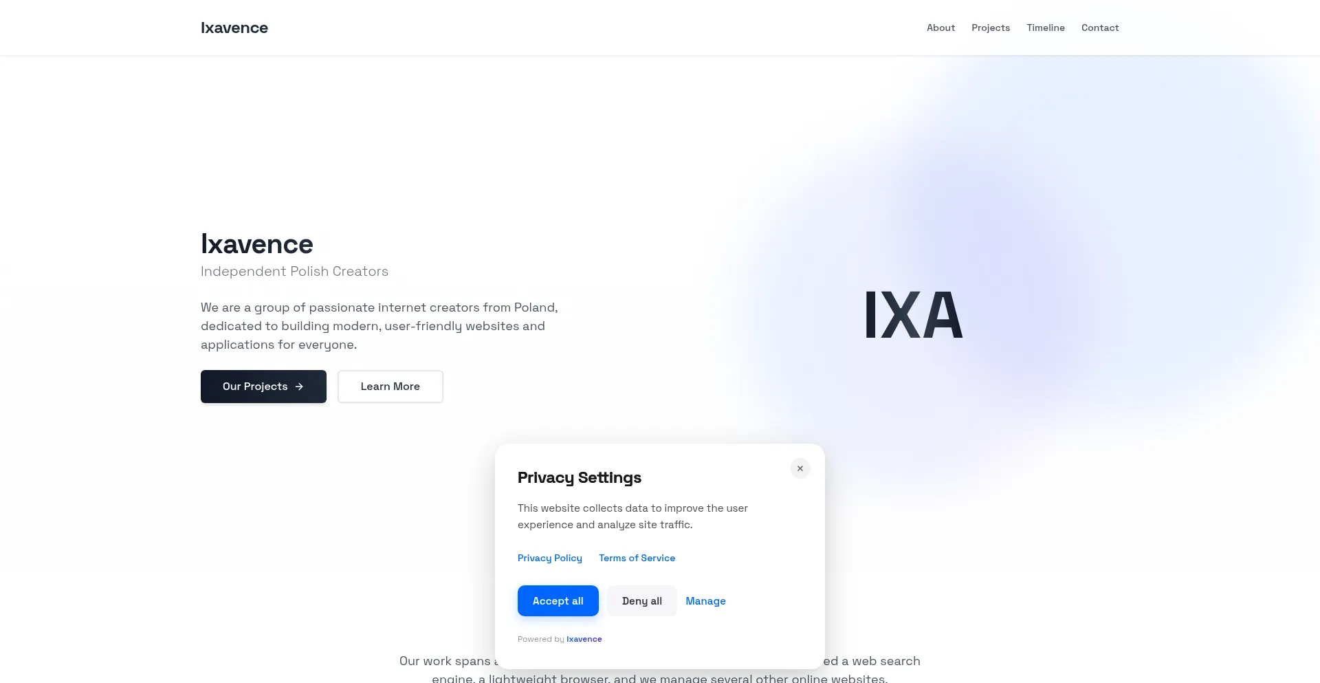 Ixavence is a collective of independent Polish digital creators. We build modern, user-friendly websites and applications, including the MevaSearch search engine, BlastBox Code ...