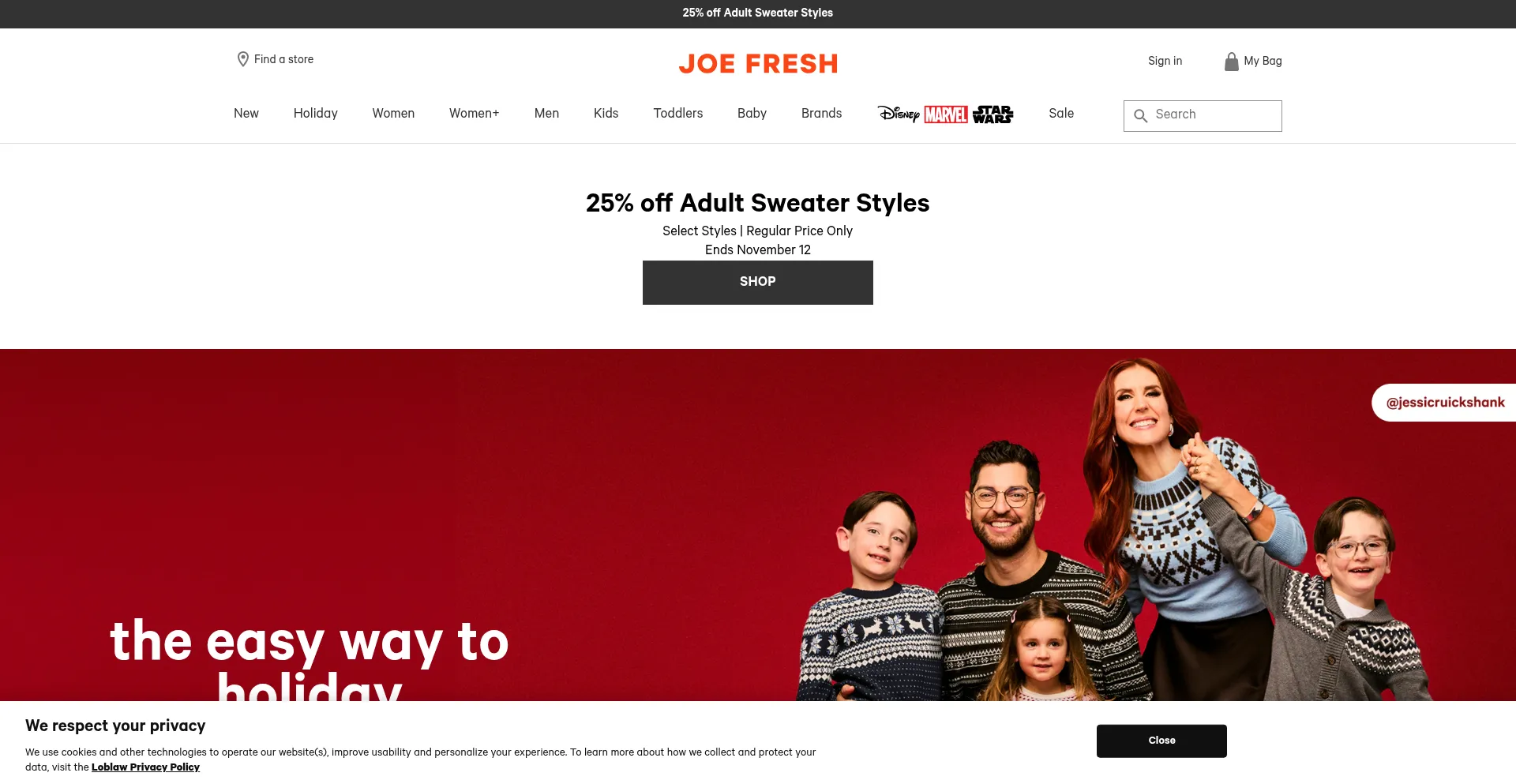 The website implements cookie consent mechanisms in compliance with privacy regulations such as GDPR or CCPA. This demonstrates that joefresh.com adheres to data protection standards and provides users with control over personal data collection practices.