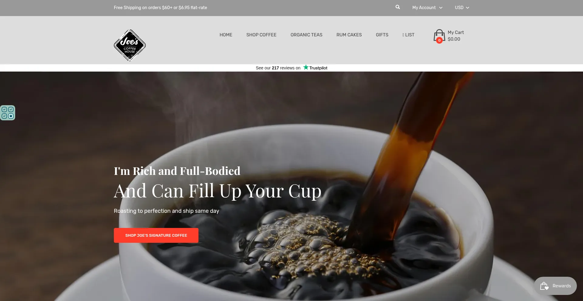 joescoffeehouse.com has a good Trustpilot score (4.9) based on 217 reviews, indicating a high level of trust from customers. It is a good sign of legitimacy!