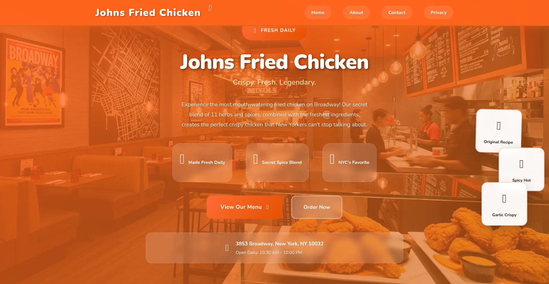 Johns Fried Chicken on Broadway NYC serves the crispiest, most delicious fried chicken in New York. Fresh ingredients, family recipes, and unbeatable flavor since day one.