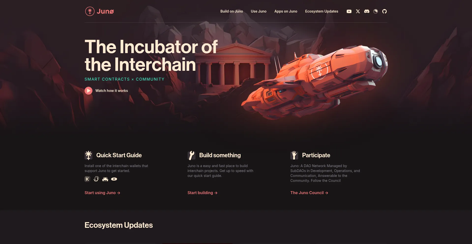 Juno is an interoperable smart contract network and a zone part of the Cosmos Network. Highly scalable, robust, secure and easy to deploy!