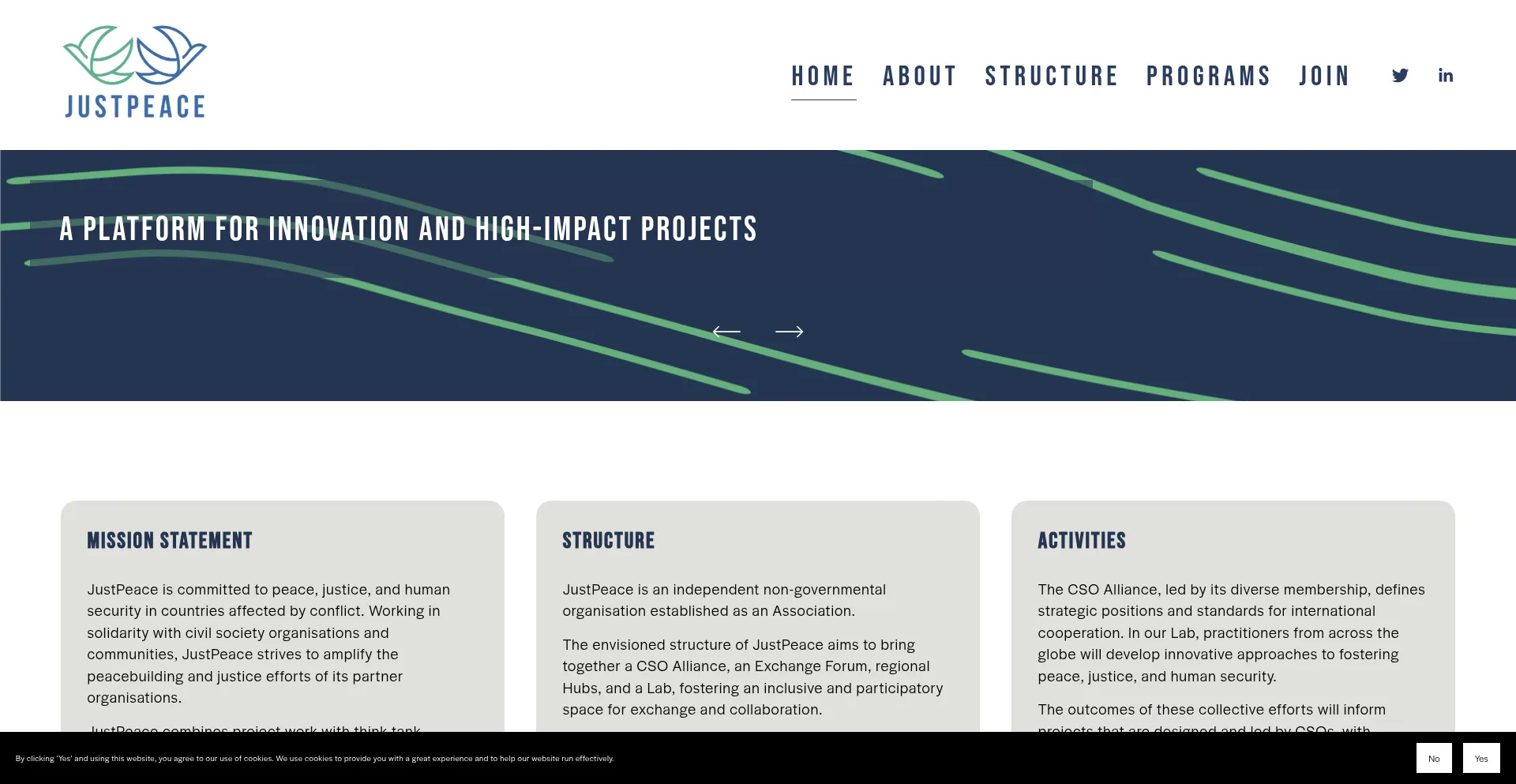 The website implements cookie consent mechanisms in compliance with privacy regulations such as GDPR or CCPA. This demonstrates that justpeace.ngo adheres to data protection standards and provides users with control over personal data collection practices.
