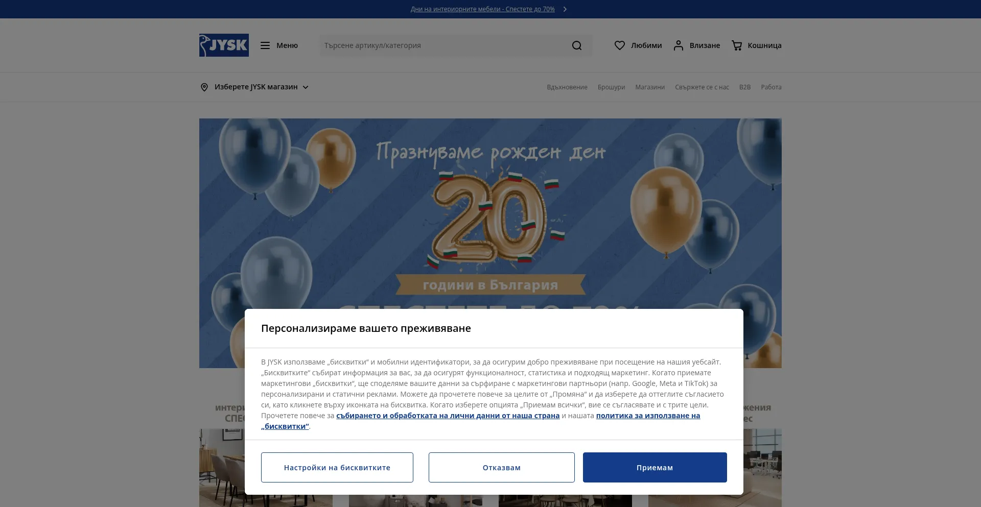 The website implements cookie consent mechanisms in compliance with privacy regulations such as GDPR or CCPA. This demonstrates that jysk.bg adheres to data protection standards and provides users with control over personal data collection practices.