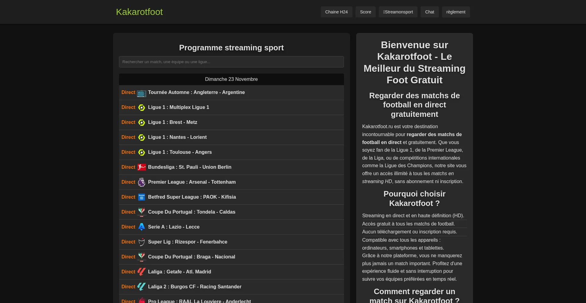 Découvrez Kakarotfoot, votre site de streaming en direct gratuit pour regarder les matchs de football en live. Suivez vos équipes préférées en HD sans inscription.