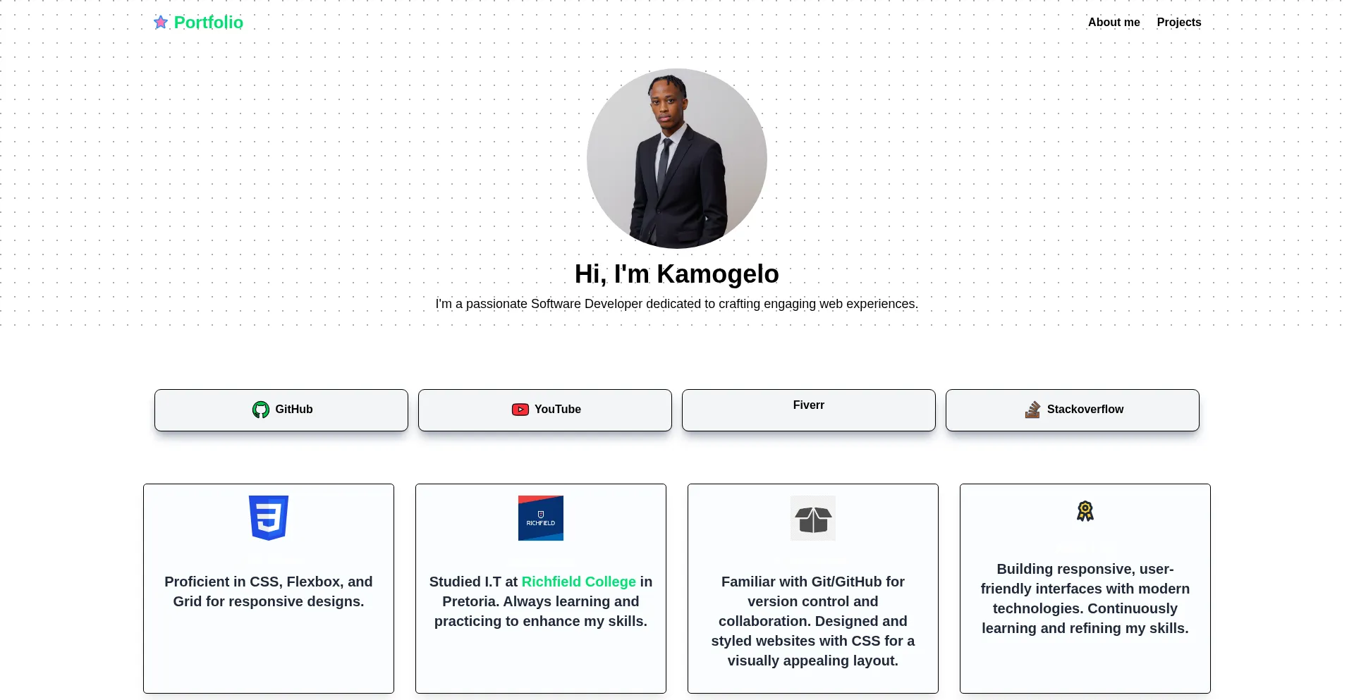 Kamogelo Mogasoa - Front-End Developer Portfolio. Explore my projects, skills, certificates, and technologies I use to build responsive and engaging websites.