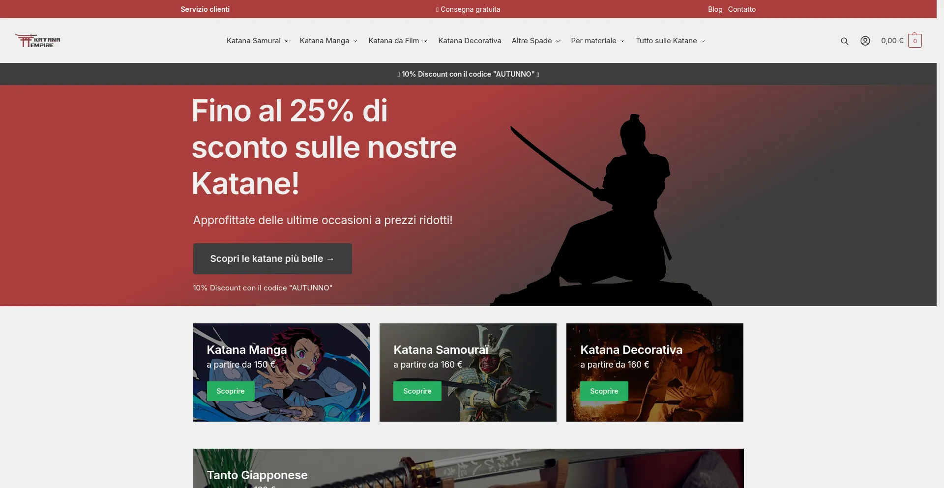 Analysis indicates that katanaempire.it operates as an e-commerce platform facilitating online transactions for goods or services. The website implements shopping cart functionality, payment processing systems, and product catalog features typical of commercial retail operations.