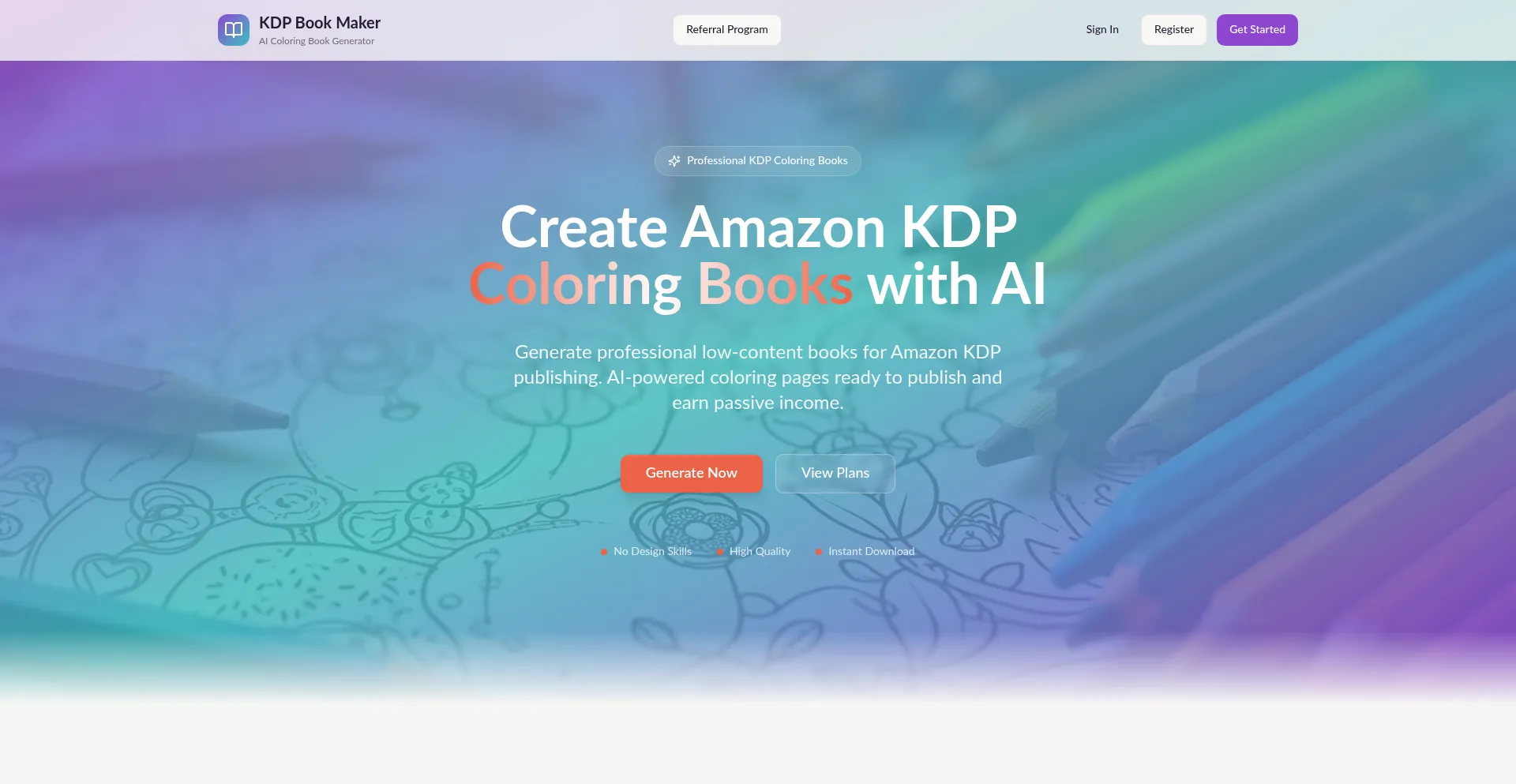 Create professional Amazon KDP coloring books with AI in minutes. Generate stunning low-content books, estimate KDP income, and start your passive income journey. Perfect for se...
