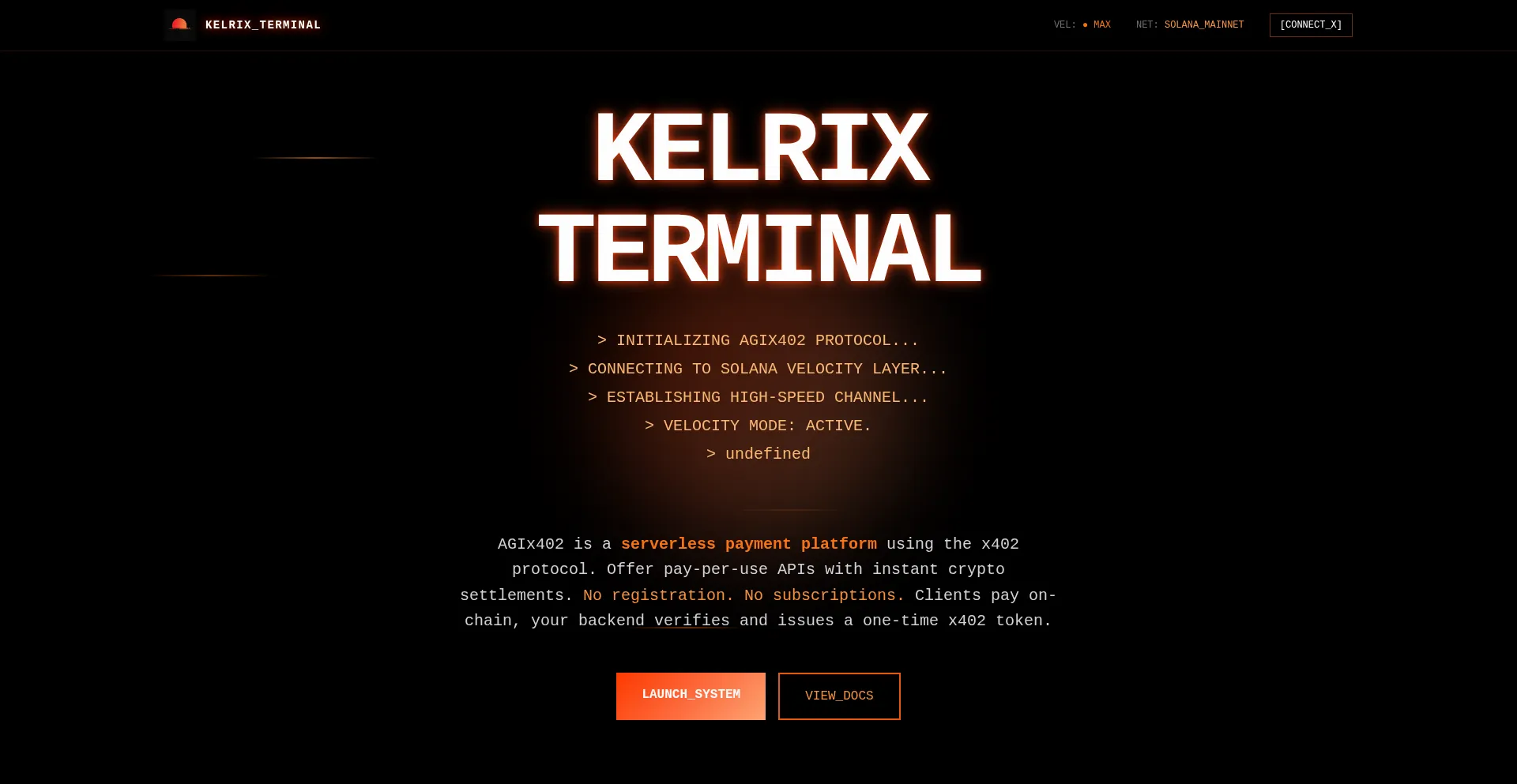 AGIx402 is a serverless payment platform using the x402 protocol. Instant. Custody-free. High-velocity.