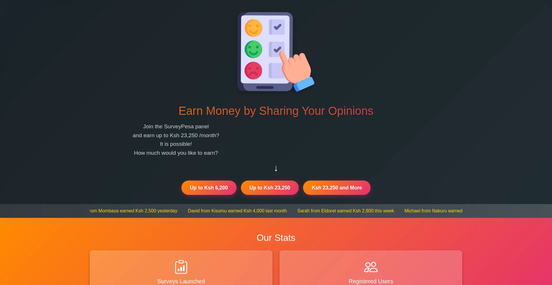 Earn up to Ksh 3,000 daily with SurveyPesa by completing surveys in Kenya. Download the app or get started online and cash out instantly via M-Pesa.