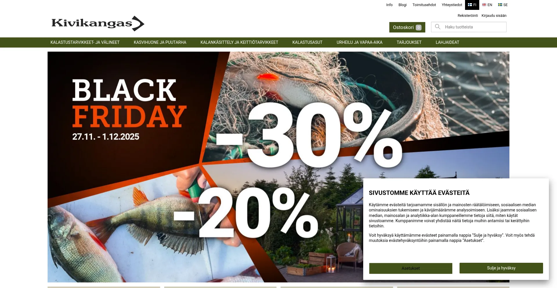 Suomen suurin valikoima kalaverkkoja, pauloja, katiskoita, koukkuja ym. välineitä kalastukseen ja vapaa-aikaan sekä maan laajin tarjonta kasvihuoneita ja kasvihuonetarvikke...