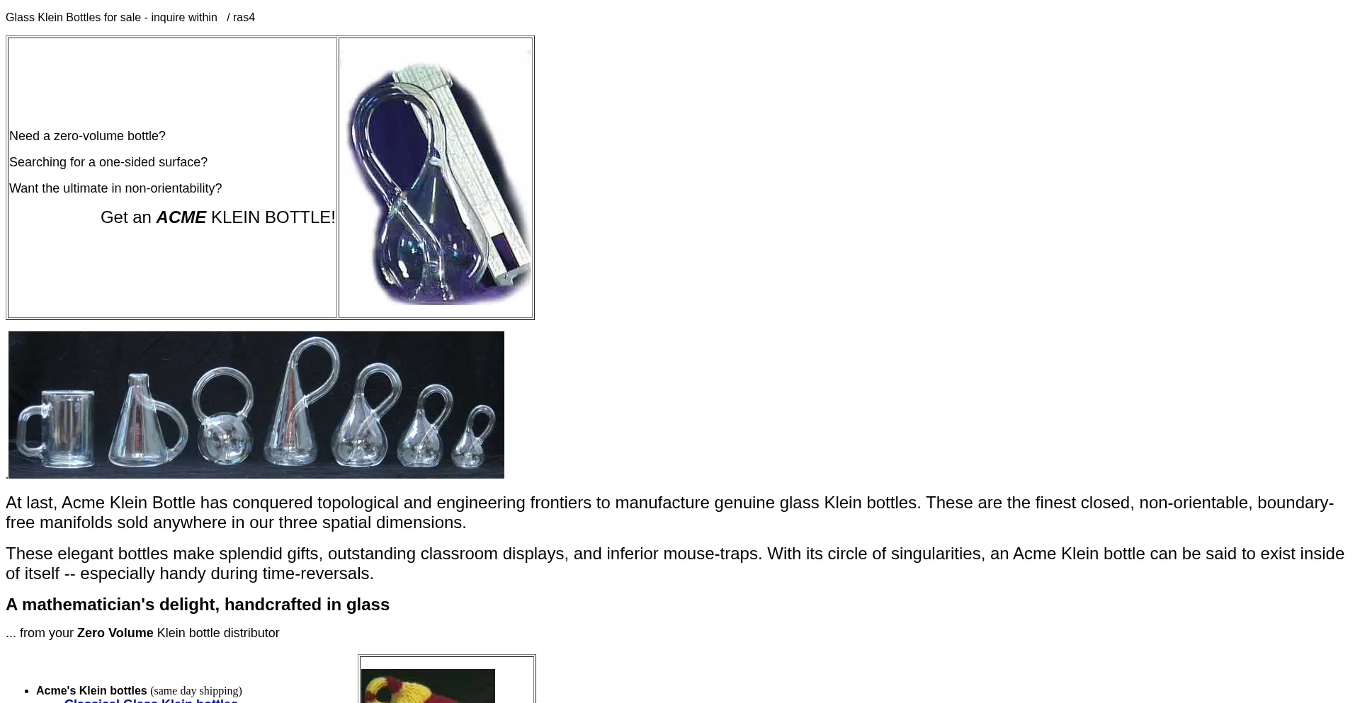 Acme Klein Bottle makes and sells glass Klein Bottles. Come visit!