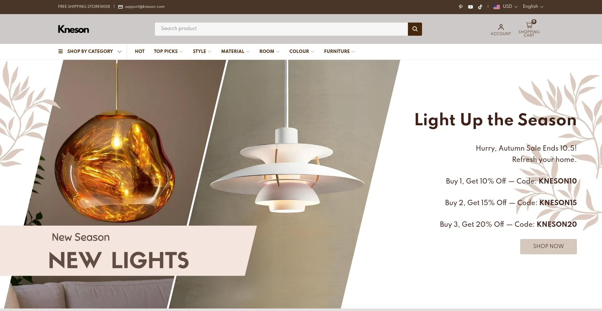Embark on an exploration of elegance with Kneson. Immerse yourself in our stylish selection of chandeliers, pendant lights, floor lamps, table lamps, and wall lights.