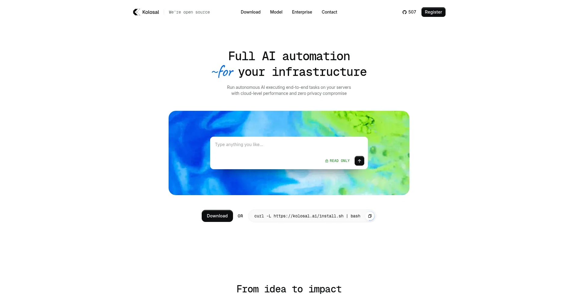 Kolosal AI is an autonomous AI software engineer that modernizes codebases, automates workflows, and runs local LLMs securely on your own infrastructure. Build faster, cheaper, ...
