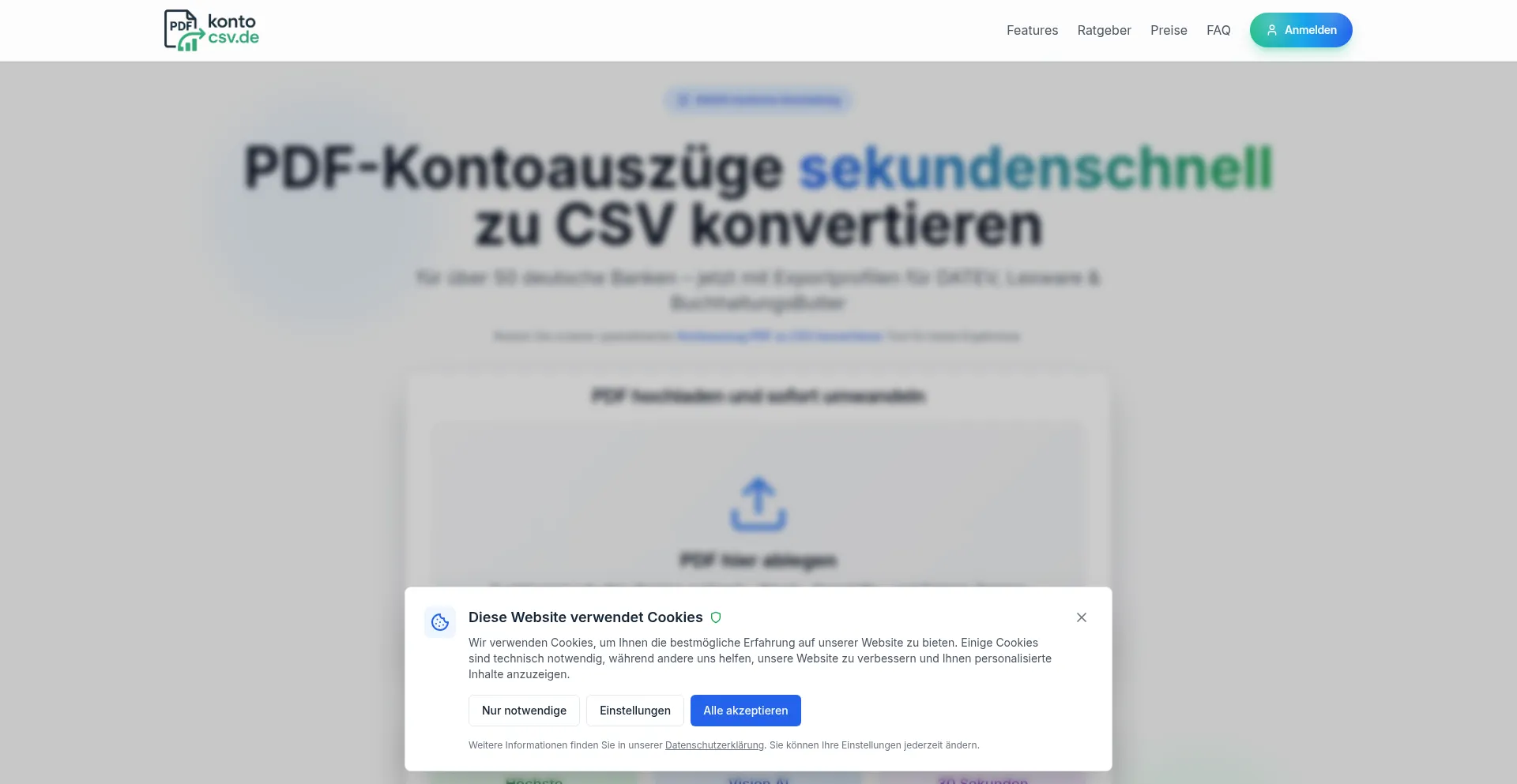 Kontoauszug PDF zu CSV konvertieren ✓ Sparkasse, Volksbank, Deutsche Bank & 50+ Banken ✓ 99,9% Genauigkeit ✓ DATEV/Lexware-Export ✓ DSGVO-konform ✓ Jetzt kostenlos tes...