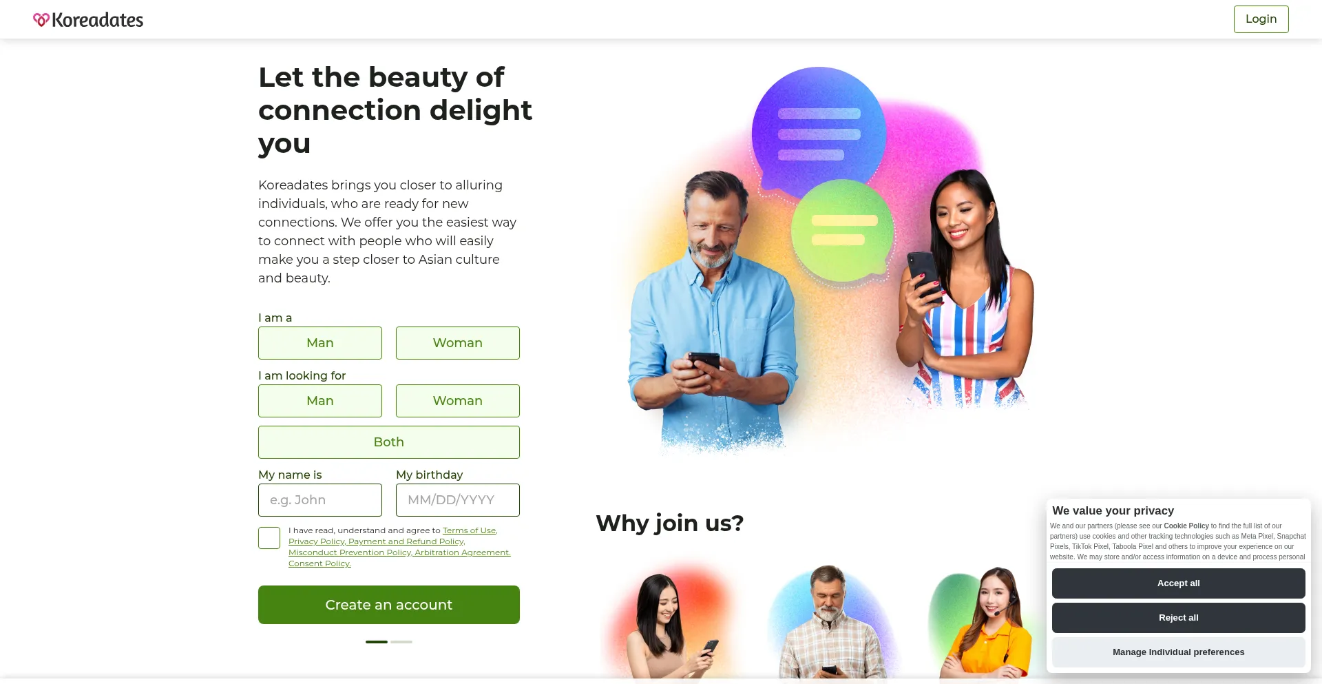 The koreadates.com website implements data collection forms requesting personal information including names, email addresses, phone numbers, or other sensitive details. Users should verify the legitimacy of it and review privacy policies before submitting personal data.