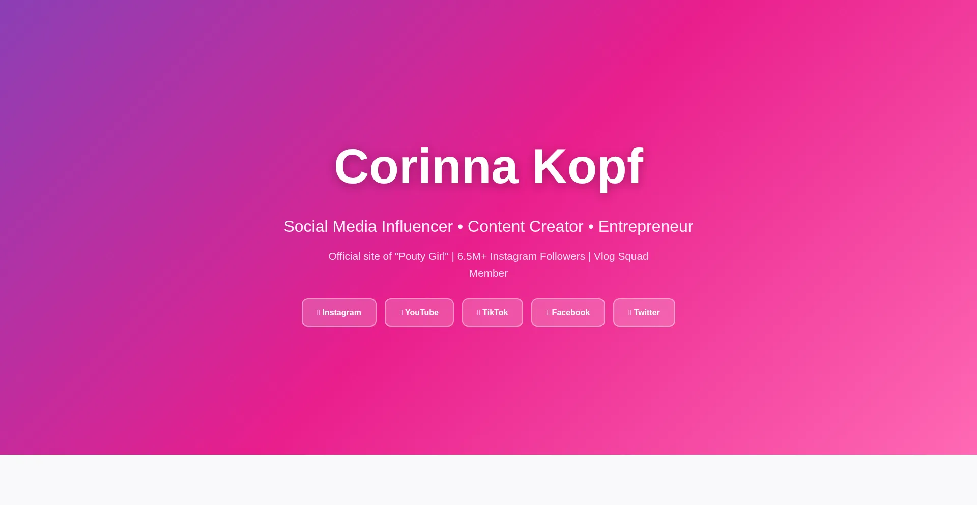 Official Corinna Kopf website featuring biography, exclusive photos, videos, career highlights, and latest news. Follow the social media star known as 'Pouty Girl' with 6.5M+ In...