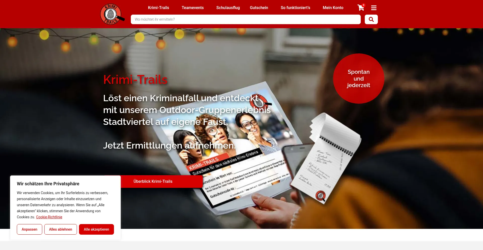 Krimi-Trails sind ein Rätselerlebnis für Krimi-Fans und Hobby-Detektive. Dabei übernehmt ihr die Ermittlungsarbeiten und geht auf Spurensuche.